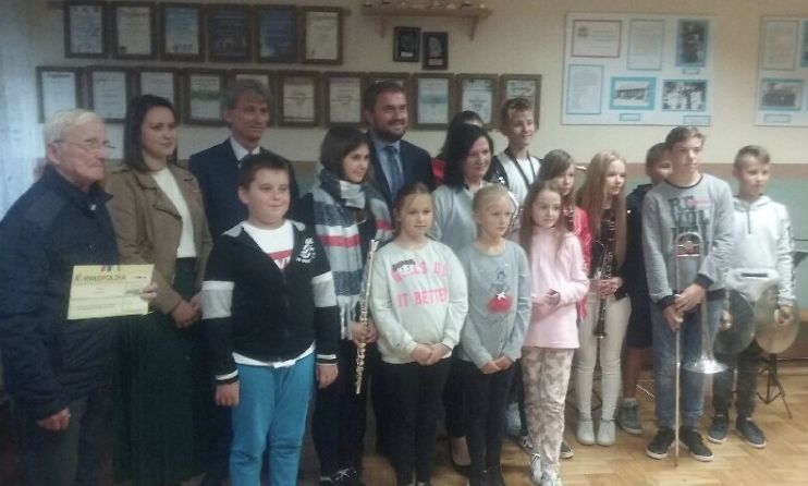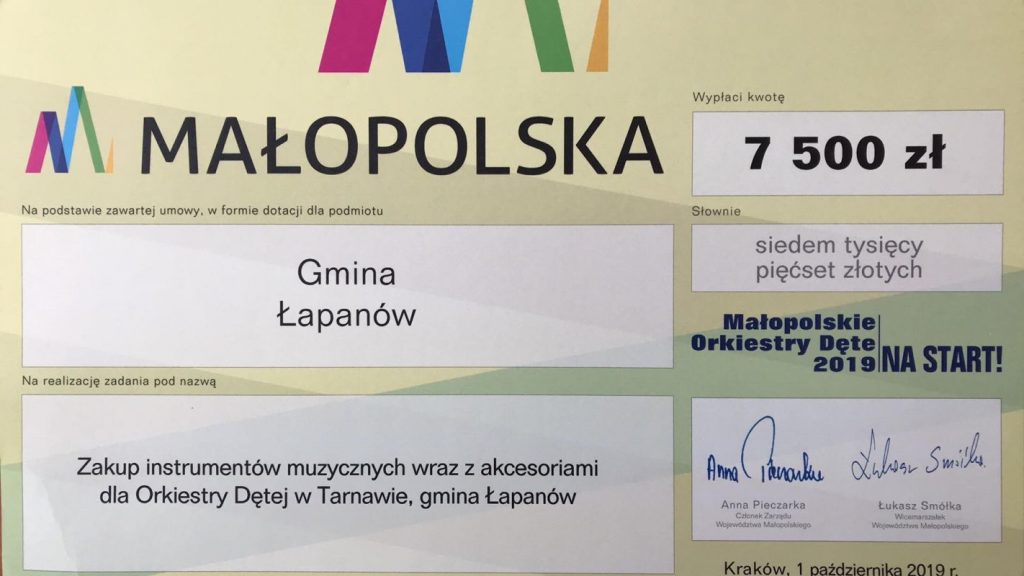 Radny Województwa Małopolskiego Stanisław Bukowiec w obecności Wójta Gminy Łapanów Andrzeja Śliwa oraz Dyrektora Centrum Kultury Wioletty Nowojowskiej w ostatni piątek tj. 05.10.2019 r. złożył na ręce naszego kapelmistrza pana Stanisława Pajora czek na kwotę 7,5 tys. zł. na zakup instrumentów muzycznych.