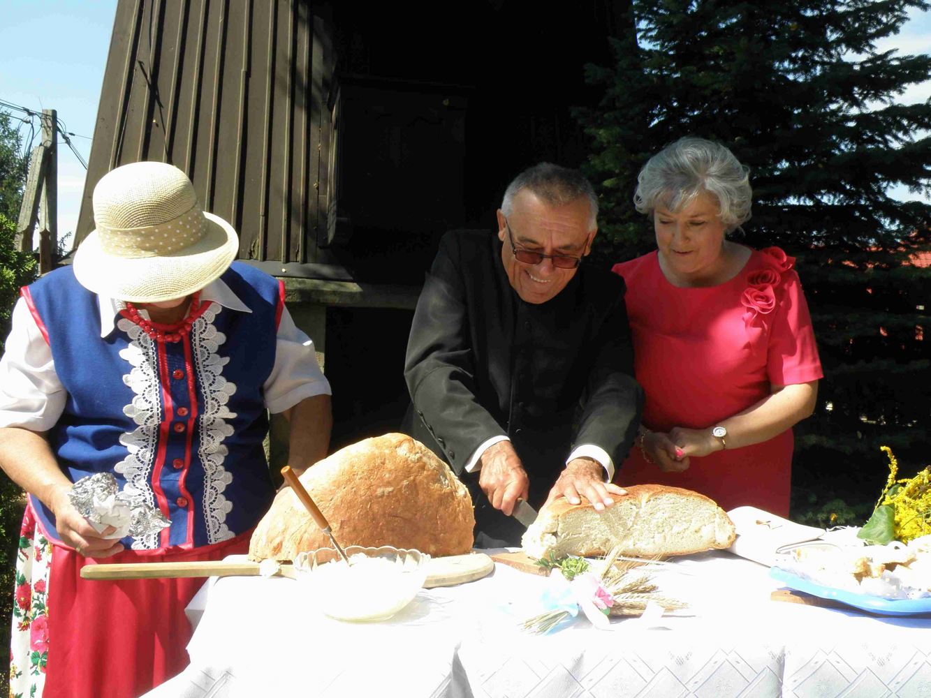 Jak co roku pięknej oprawie dożynkowej towarzyszył barwny korowód, w którym brały udział zespoły działające przy Domu Kultury, delegacje z poszczególnych wiosek oraz kapela ludowa pod kierunkiem Stanisława Chmielka. Swoją obecnością zaszczycił nas również dyrektor CKGŁ – Michał Paszkot, Radny Gminy – Andrzej Śliwa, Mirosław Drożdż, sołtys wsi Sobolów – Stanisław Kufta oraz gospodarze pozostałych sołectw. Podczas Eucharystii, którą celebrował ks. Stanisław Jachym, dziękowaliśmy Bogu za zebrane plony, składając dary w postaci chleba, owoców, warzyw, kwiatów i pięknie wykonanych wieńców. Po zakończeniu podniosłego nabożeństwa na placu kościelnym przy dźwiękach ludowej kapeli nastąpił obrzęd dzielenia się chlebem. Panie z KGW Sobolów oraz gospodarze Grabiny częstowali nie tylko wiejskim chlebem, masłem, ale również tradycyjnym drożdżowym ciastem. Niewątpliwie tego dnia największą uwagę zebranych gości przykuł konny obchód wokół dziedzińca kościelnego, czego dowodem były błyskające flesze.