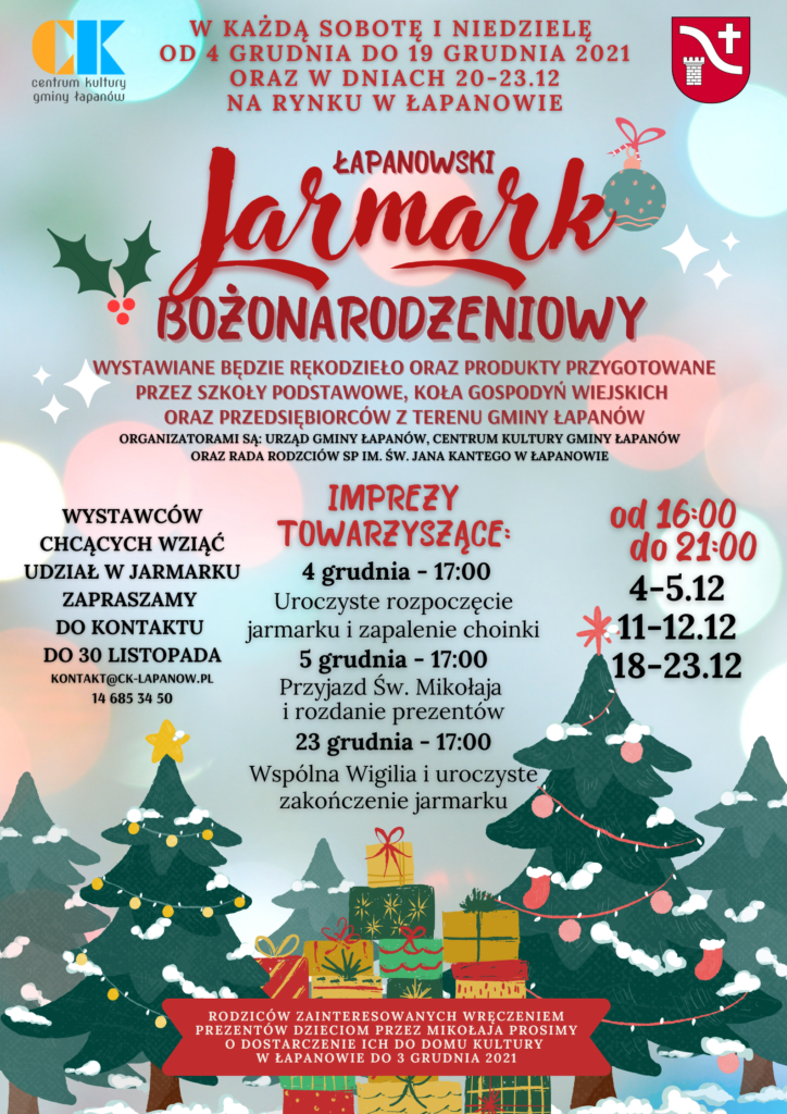 W grudniowe weekendy od 16:00 do 21:00 oraz w dniach 20.12 – 23.12 będzie można odwiedzać kramy wypełnione produktami i rękodziełem przygotowanym przez szkoły podstawowe, koła gospodyń wiejskich oraz przedsiębiorców z terenu Gminy Łapanów.