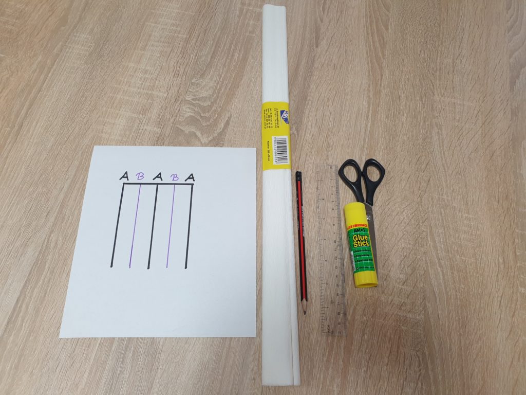 4. Wycięte kwadraty musimy ze sobą posklejać. W tej czynności pomoże nam kartka z liniami pomocniczymi.
