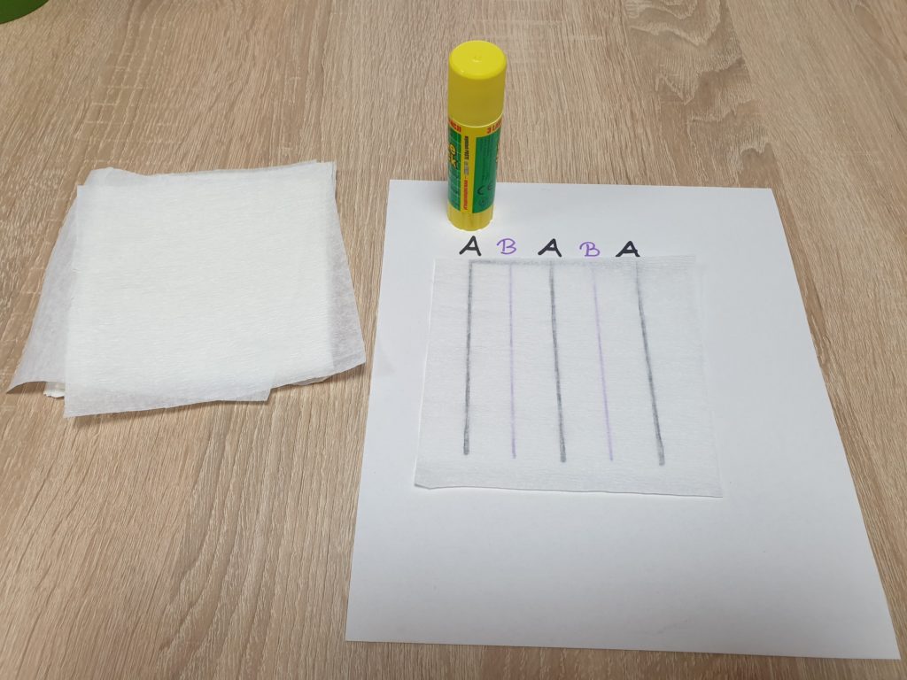 5. Na szablon kładziemy pierwszy bibułowy kwadrat i w miejscu czarnych linii smarujemy klejem a następnie naklejamy kolejną bibułkę i ponownie smarujemy klejem ale tym razem w miejscu linii fioletowych. W ten sposób sklejamy naprzemiennie wszystkie bibułowe karteczki.