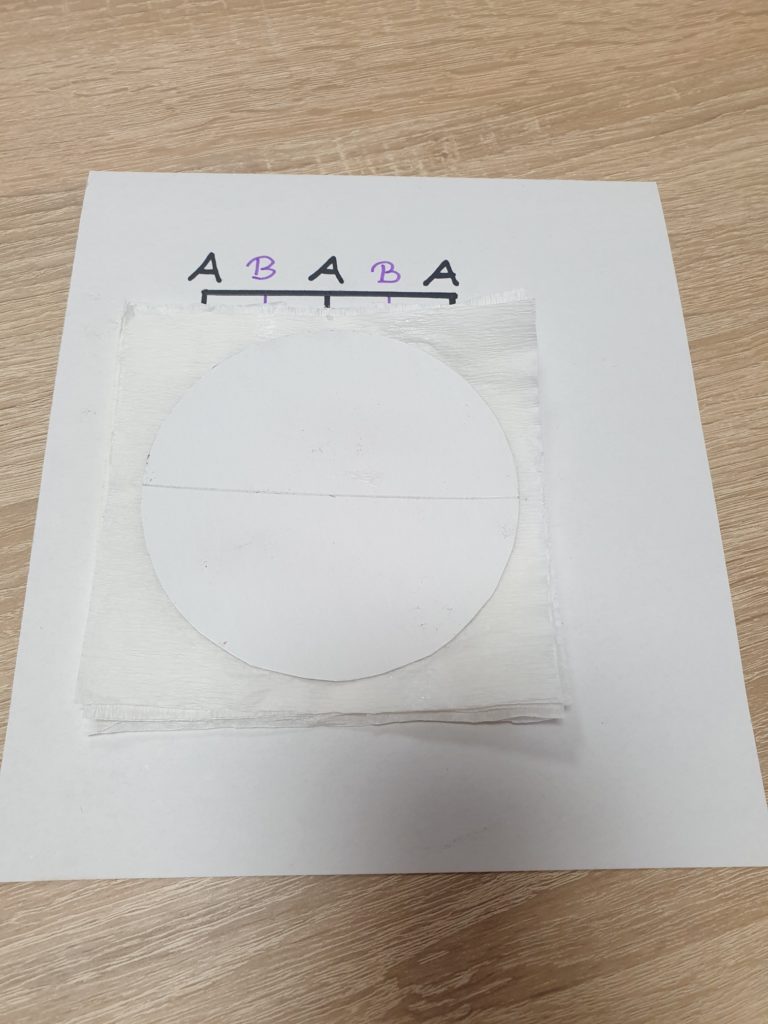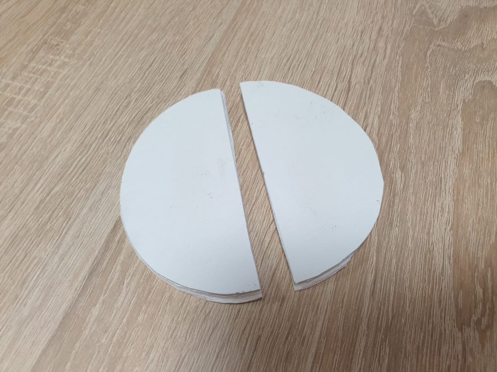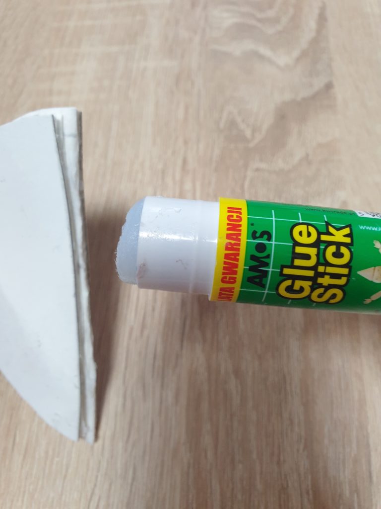 7. Wycięte połówki koła przyklejamy, jedną z przodu a drugą z tyłu bibułek.