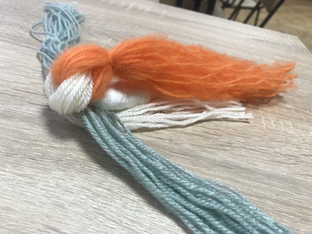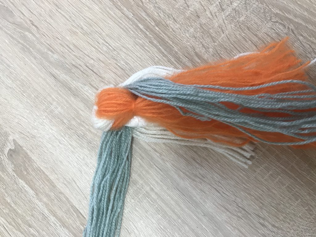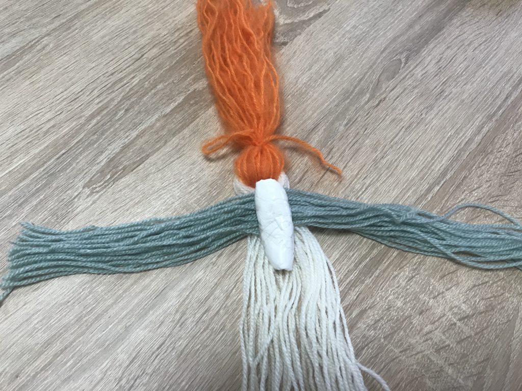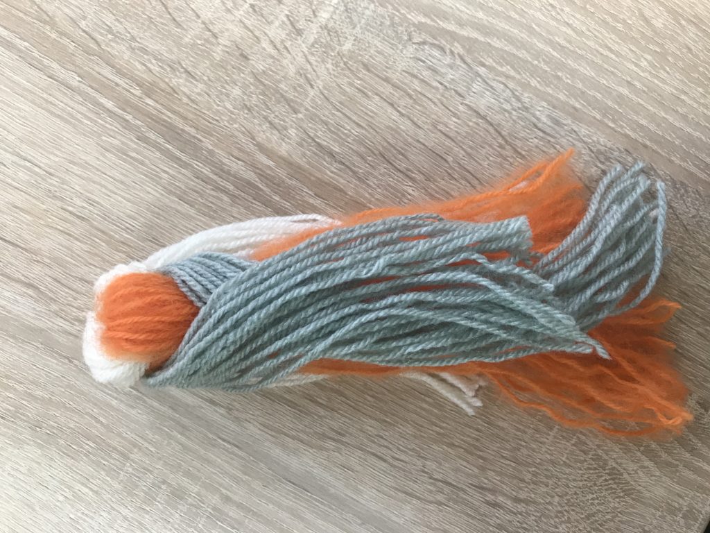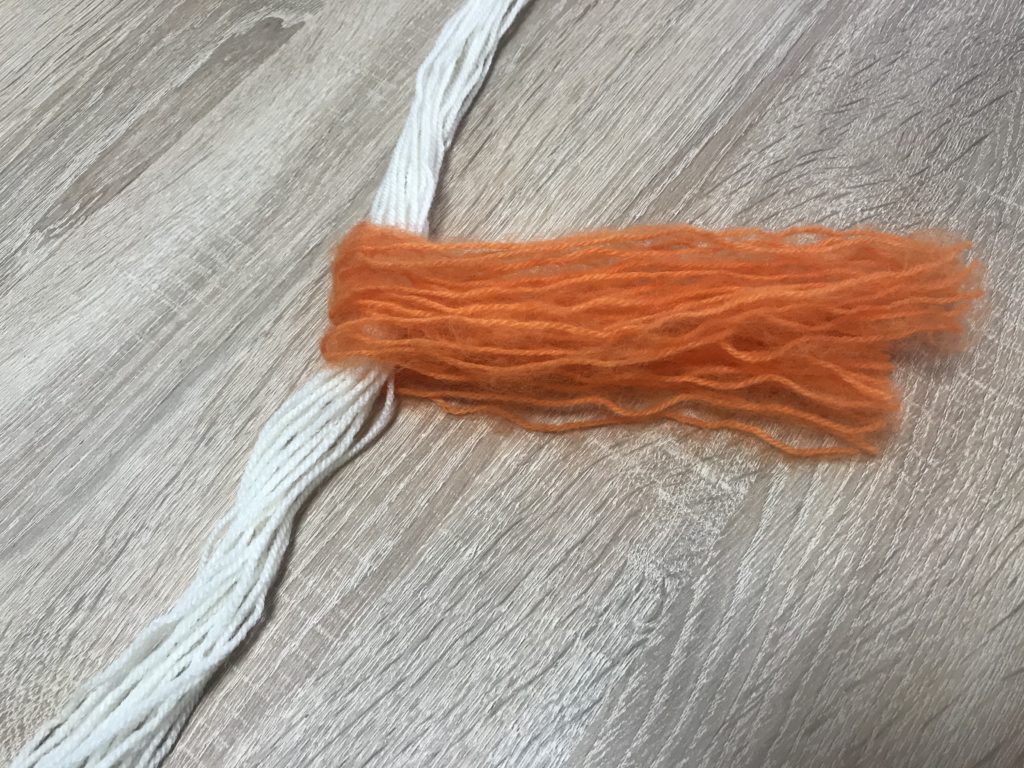 4. Białą i pomarańczową wełnę nakładamy na siebie, zwijamy w połowie