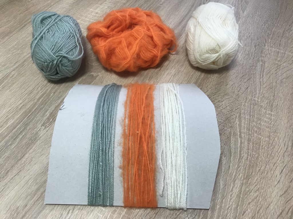 1. Szarą włóczkę nakładamy na pomarańczową.