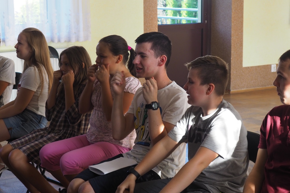 17 września 2018 roku Dom Kultury w Łapanowie odwiedził wyjątkowy nauczyciel sztuki aktorskiej pan Bogdan Brzyski, aktor Teatru Starego w Krakowie. Celem przyjazdu do Łapanowa były warsztaty teatralne z młodzieżową Grupą Teatralną i Filmową ANIMUSZ działającą przy Domu Kultury  i Parafii św. Bartłomieja. Warsztaty podzielone były na dwie części. W pierwszej pan Bogdan uczył jak rozluźniać ciało przez śmieszne ćwiczenia, a nawet wygłupianie się, aby zdobyć umiejętność pozbywania się stresu przed występami. Takie ćwiczenia mają ważne zadanie w integrowaniu grupy. Uczestnicy takich śmiesznych ćwiczeń otwierają się na siebie tworząc pomosty wzajemnej współpracy w tworzeniu dzieł teatralnych. Kolejnym ćwiczeniem ciała dotyczyło mimiki twarzy. Nasz niezwykły Gość pokazywał jak operować językiem, aby jak najwydajniej emitować głos zrozumiały dla widzów. Za przykładem pana Bogdana językiem obrysowywaliśmy usta, wydawaliśmy śmieszne odgłosy, robiliśmy dziwne miny. Tylko po to aby zapomnieć o wszystkich napięciach i przejść do drugiej części warsztatów.