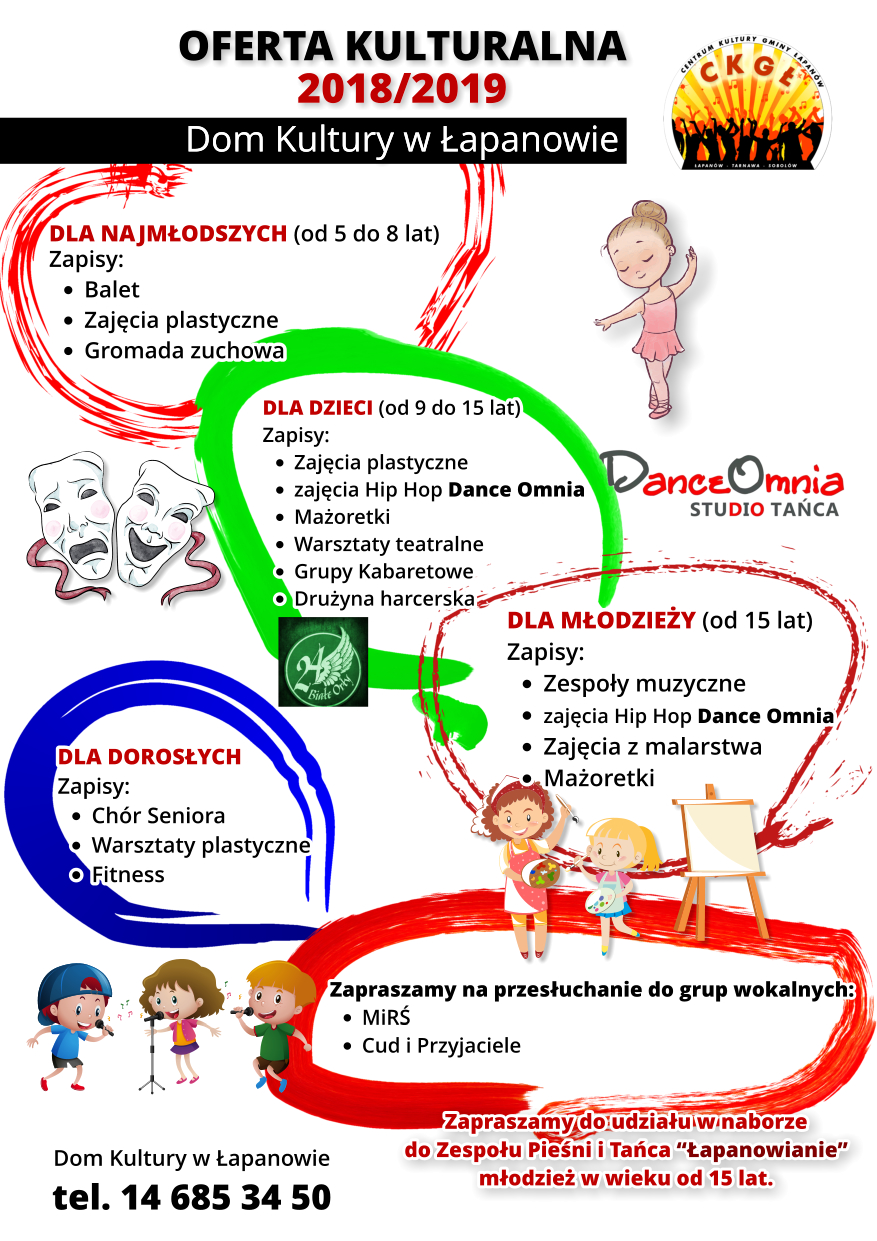 Zapraszamy do zapoznania się z ofertą kulturalną CKGŁ 2018/2019 kierowaną do dzieci, młodzieży i dorosłych. Na zapisy do wszystkich grup czekamy do 14 września, zajęcia rozpoczną się w październiku szersze informacje w Domu Kultury w Łapanowie lub pod nr tel. 14.685 34 50