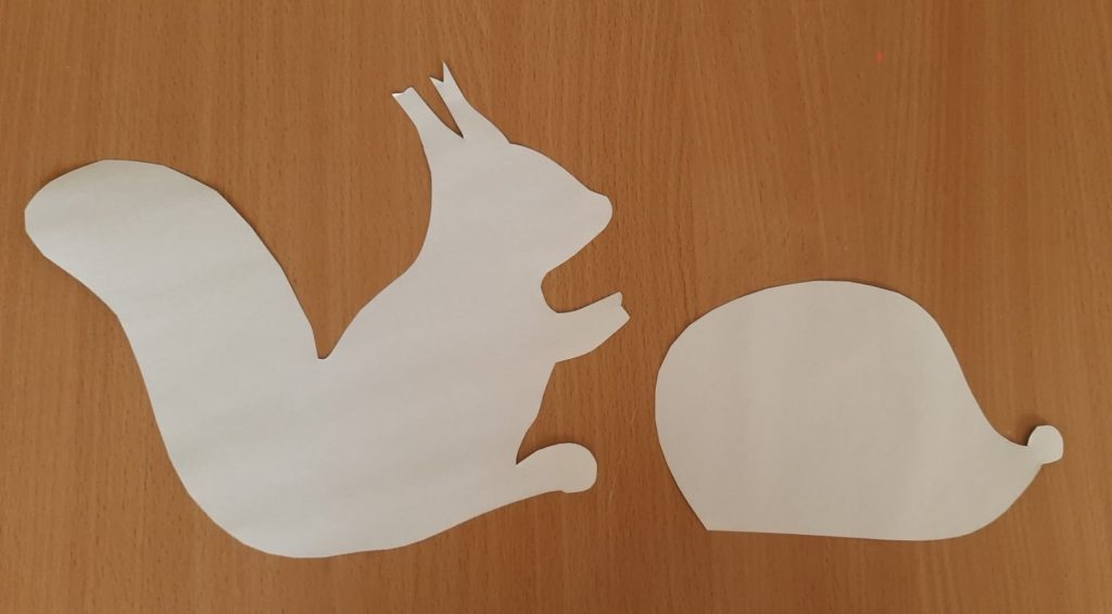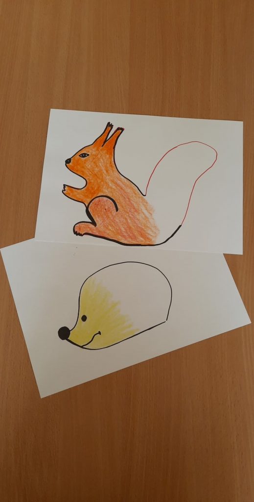 Na kartce narysuj jeża i wiewiórkę, obrysuj pisakiem, namaluj oczy i pyszczek.