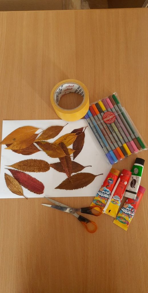 Przygotuj : kartki papieru, kolorowe liście, kredki lub farby, pisak, nożyczki, klej.