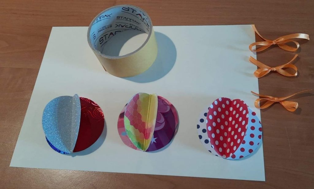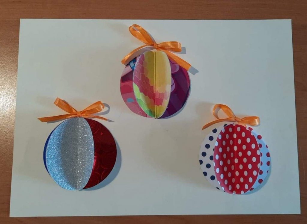 Świąteczne dekoracje – papierowe bombki Przygotuj : kolorowe kartki, wstążeczki, klej lub taśmę dwustronną, nożyczki.