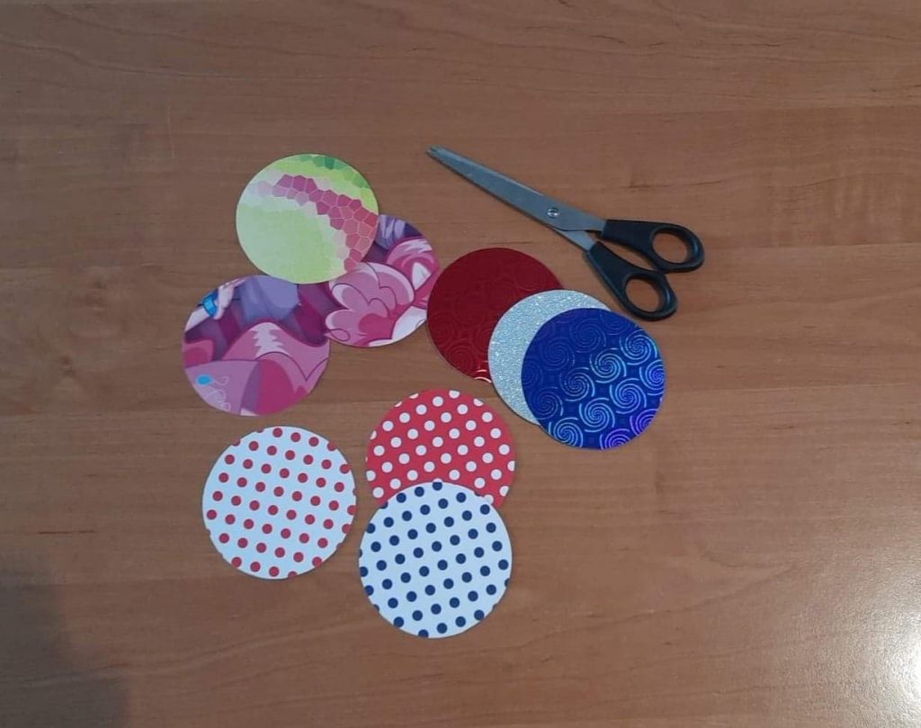 Każde kółko złóż na pół, klejem posklejaj boki . Z wstążki zrób kokardki.