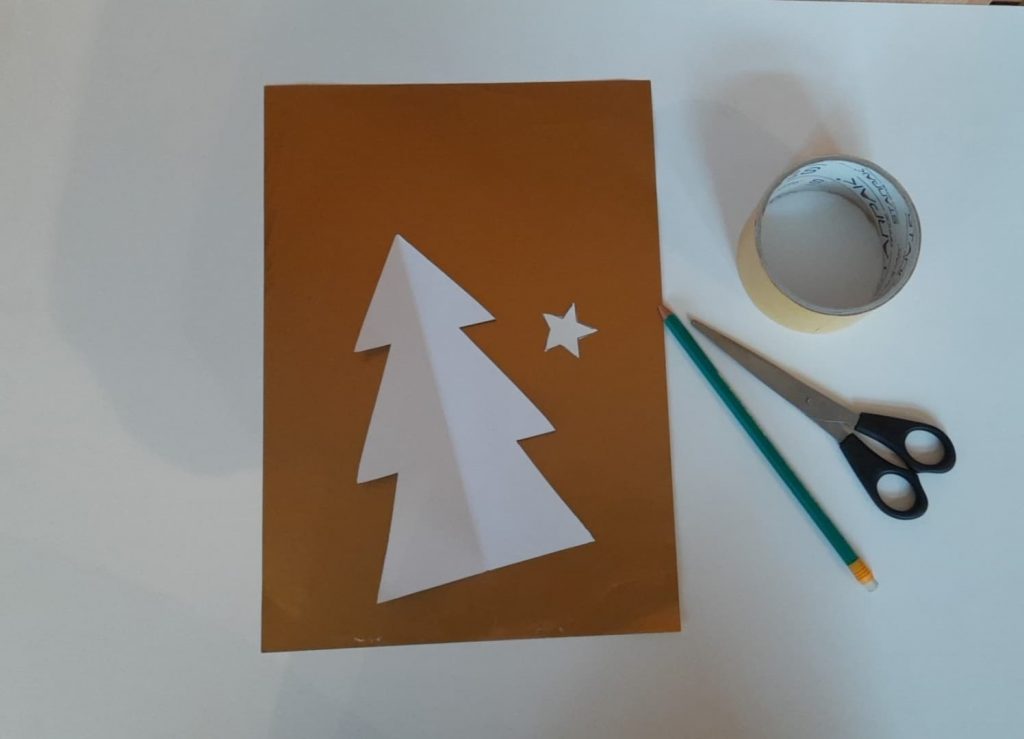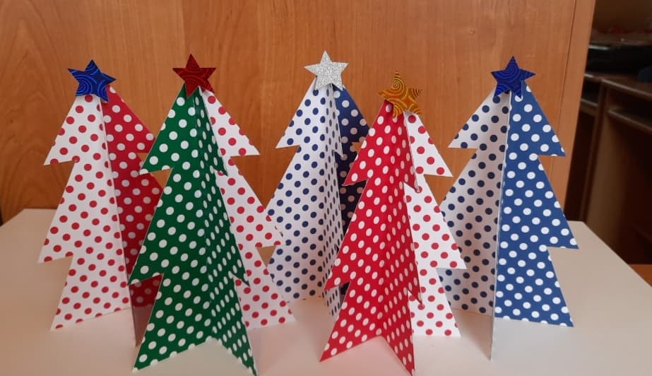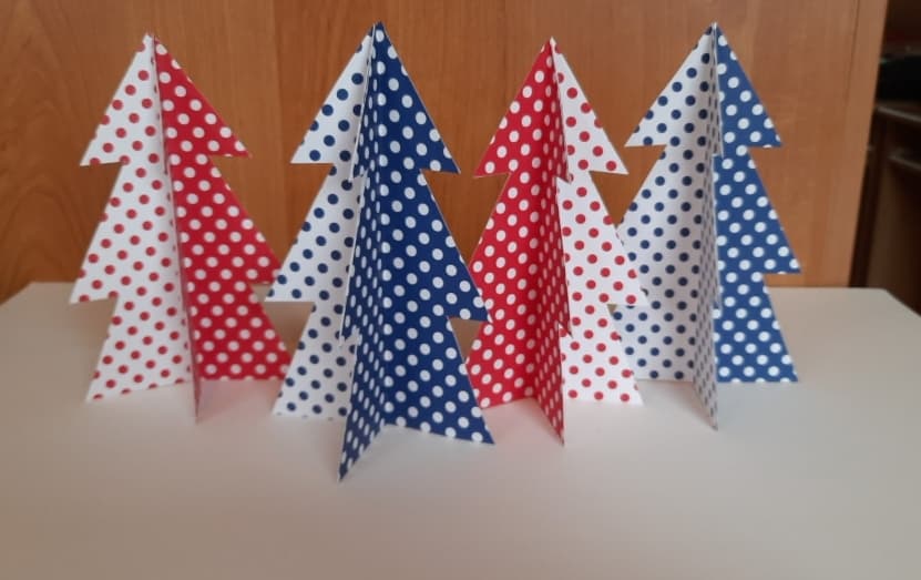 Na kartce narysuj choinkę i wytnij. Szablon choinki przykładaj do kolorowych kartoników, odrysuj i wycinaj.