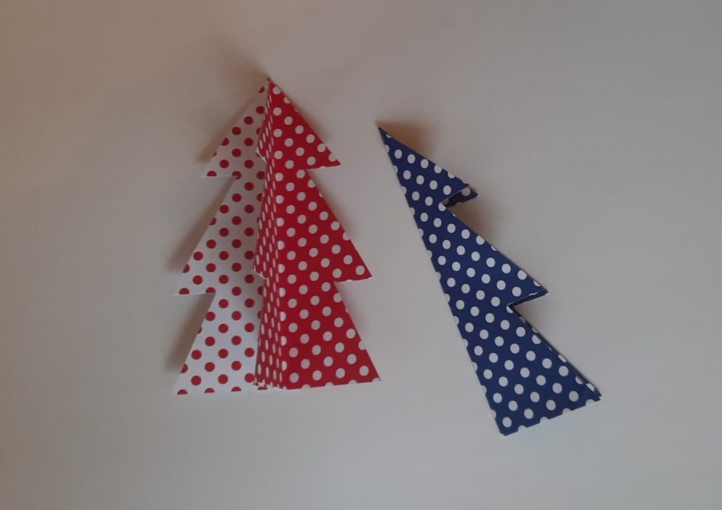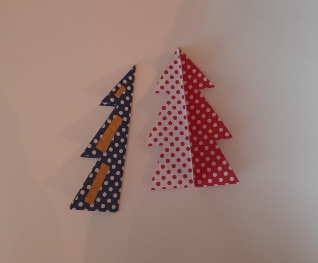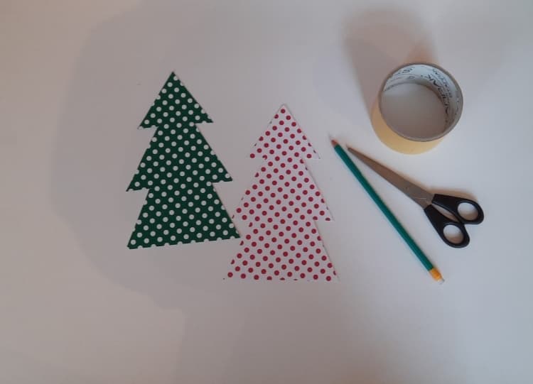 Każdą choinkę złóż na połowę. Na jednym boku przyklej taśmę, przyłóż równo drugą choinkę i razem posklejaj.