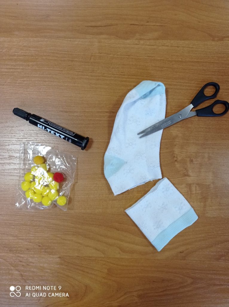 Przecinamy skarpetkę aby odciąć ściągacz, z którego zrobimy czapkę.