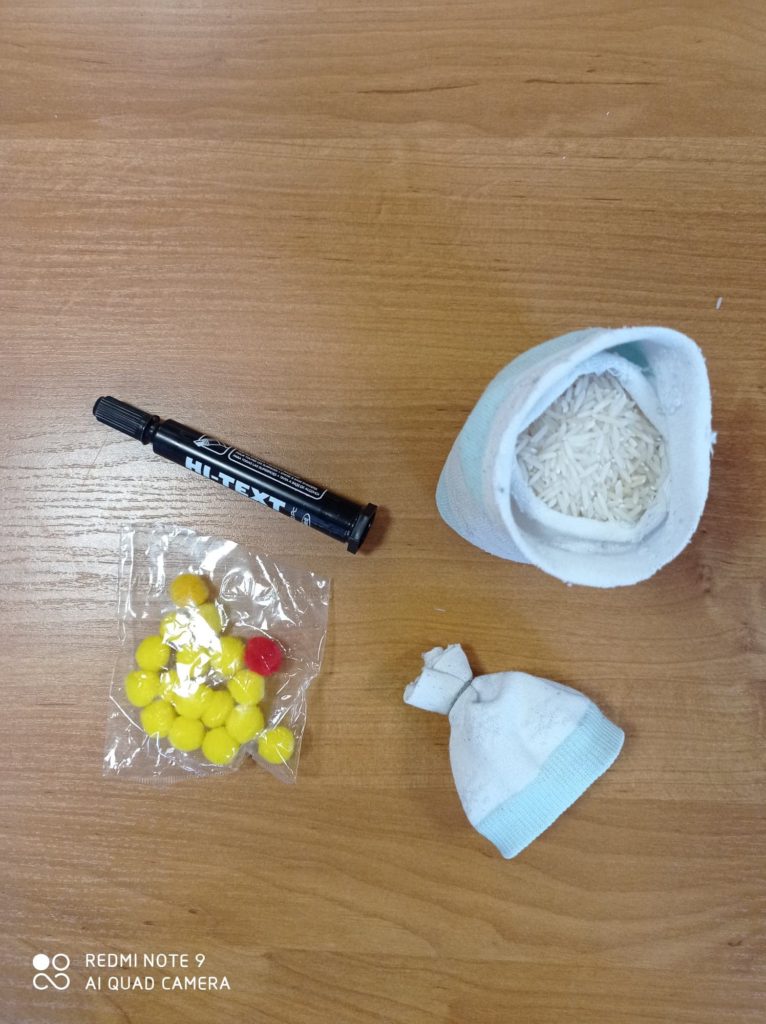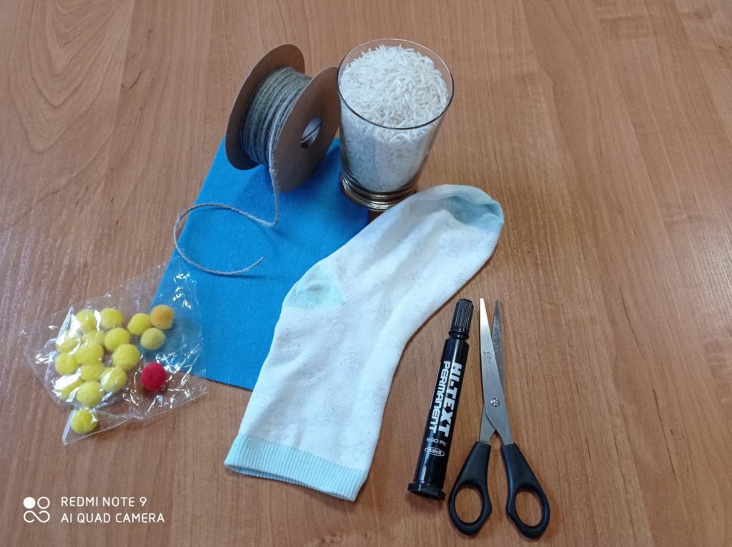 Do drugiej części skarpetki wsypujemy ryż, tasiemką związujemy i odcinamy nadmiar skarpetki.