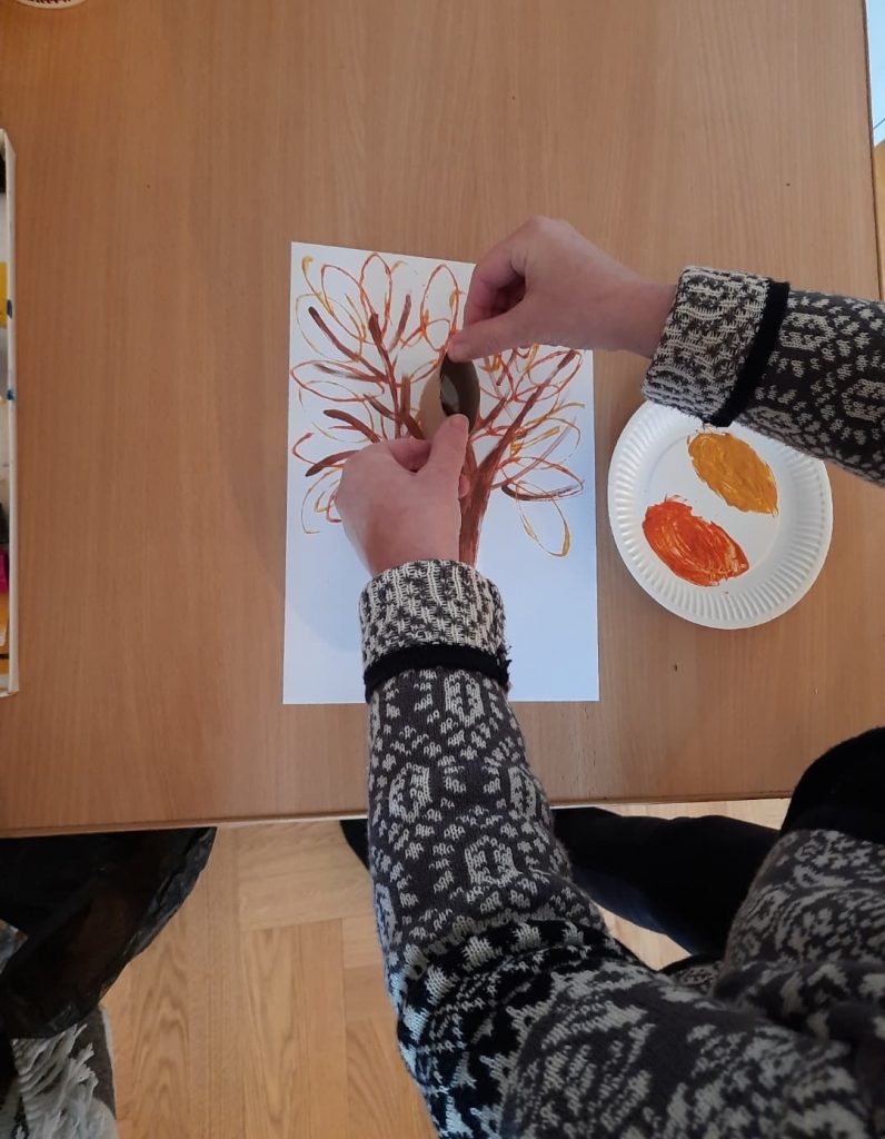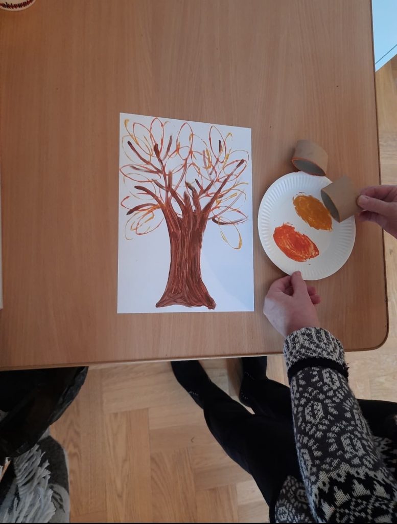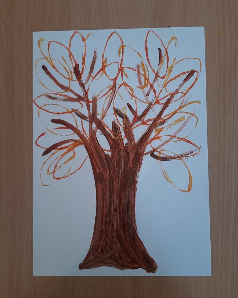 JESIENNE DRZEWO Przygotuj farby, pędzel, kartkę papieru i rolkę z papieru toaletowego.