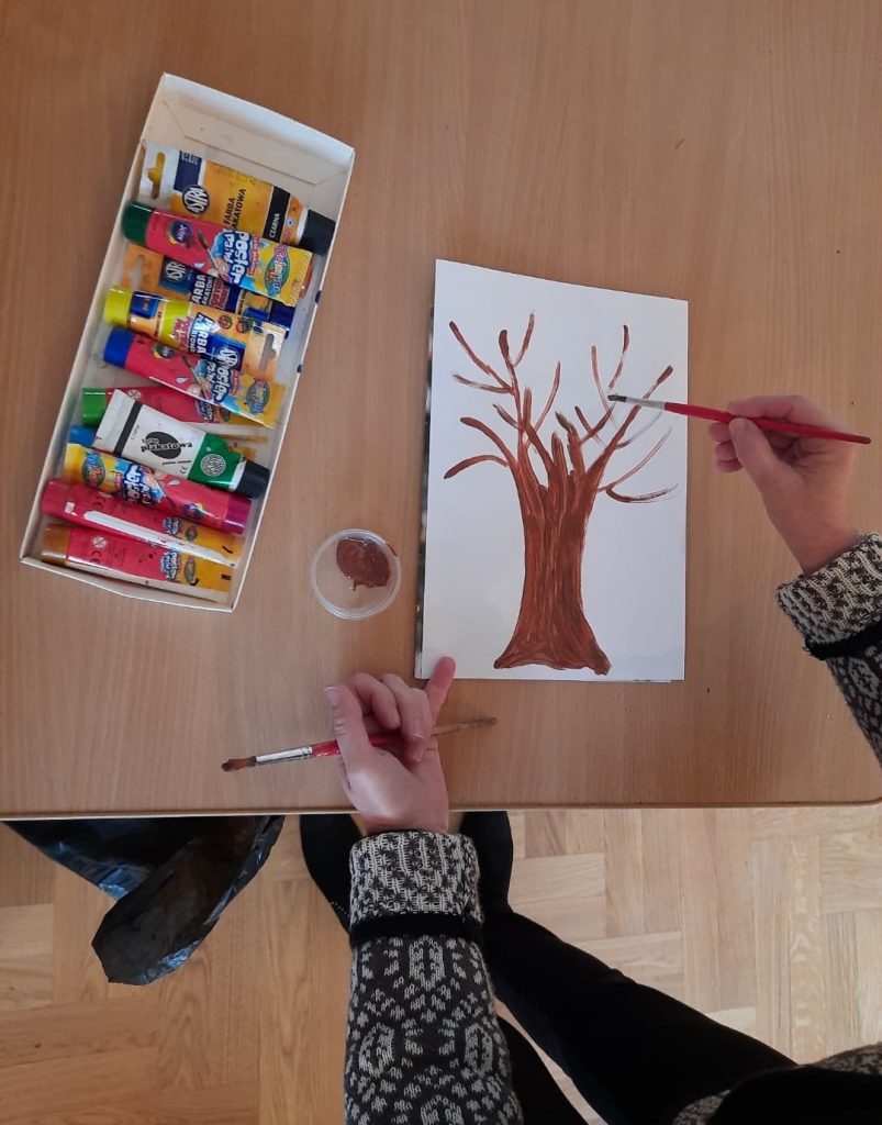 Rolkę zamaczaj w farbce i nakładaj na drzewo.