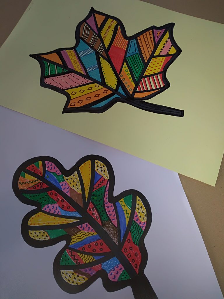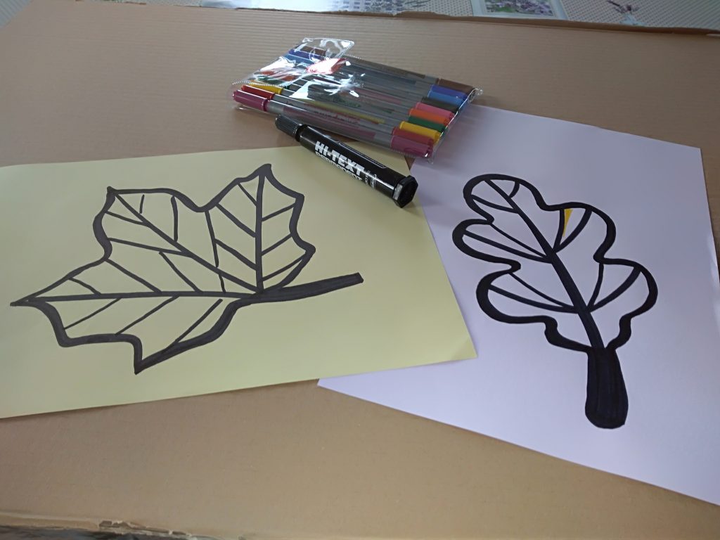 Na kartce narysuj dowolny liść czarnym mazakiem obrysuj kontur