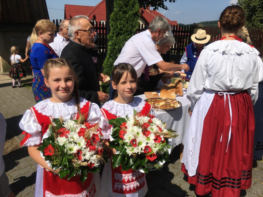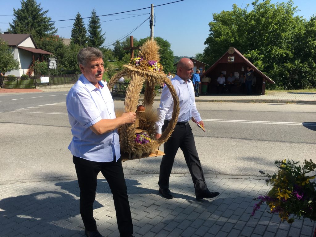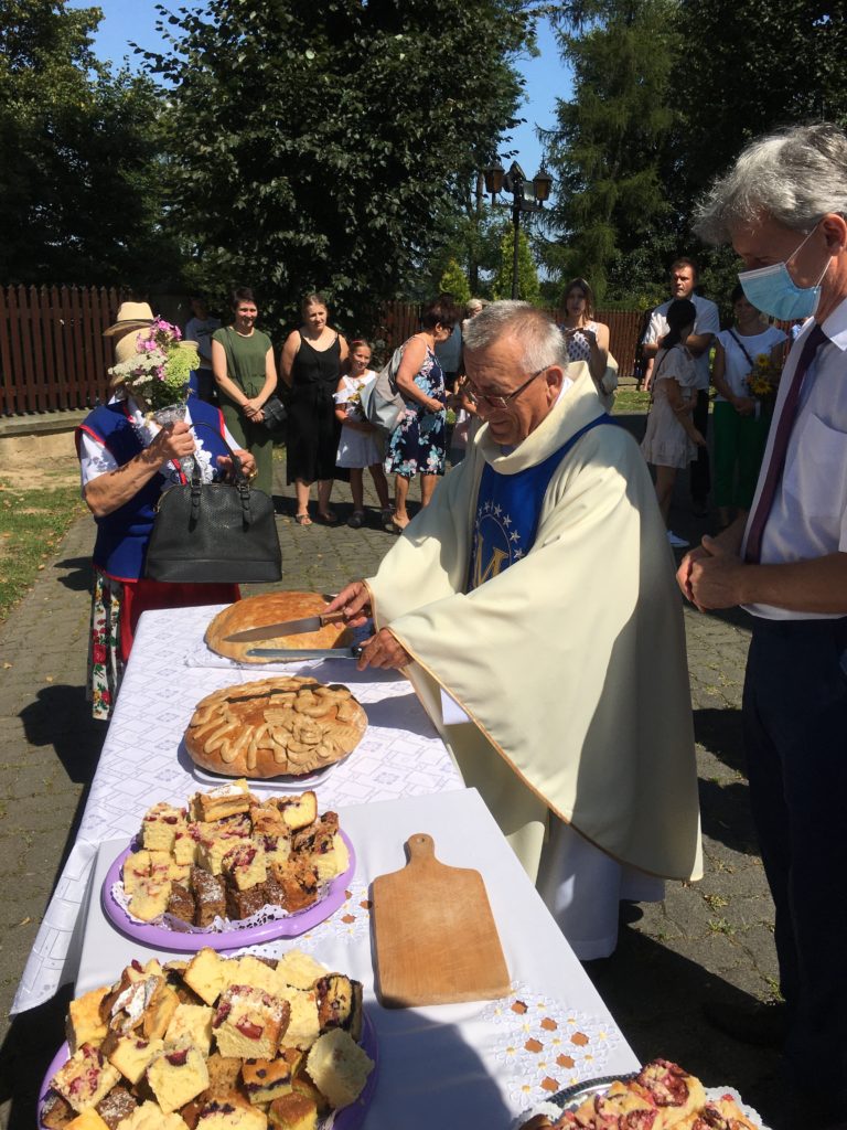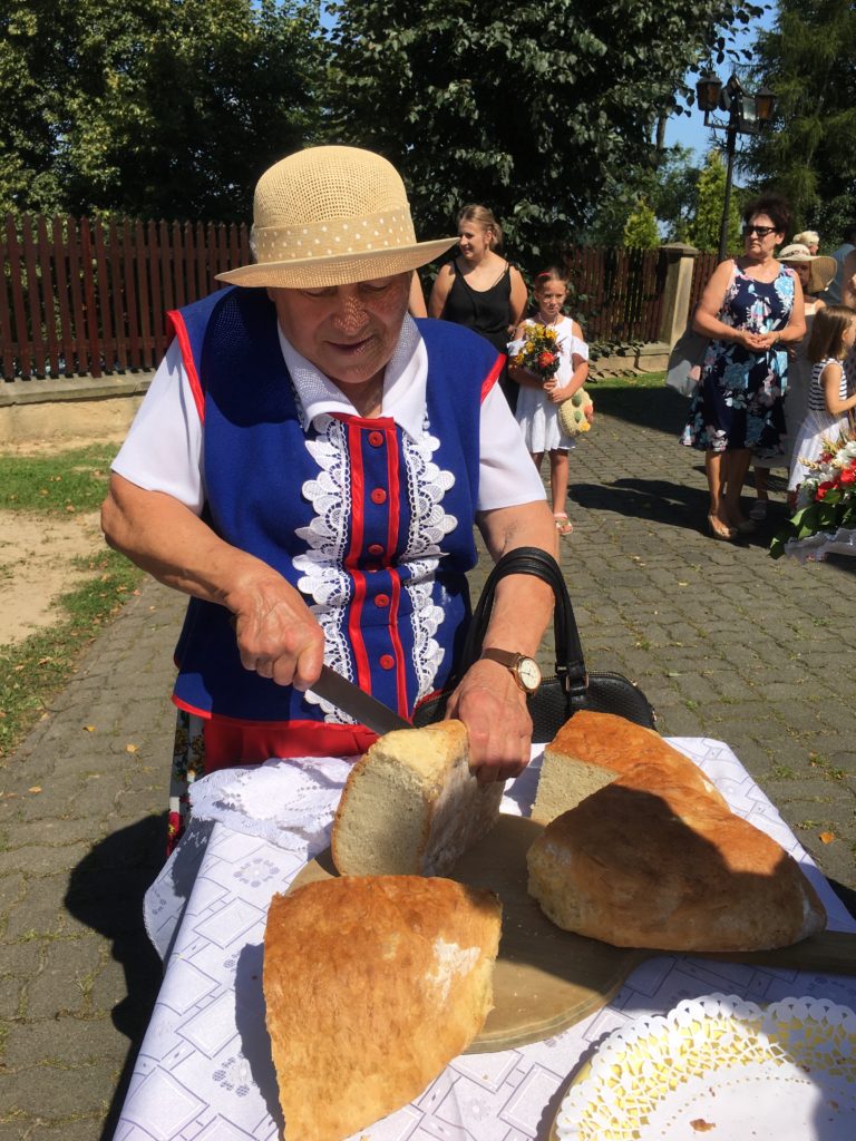 Podczas uroczystej Eucharystii, którą celebrował ks. Stanisław Jachym dziękowaliśmy Panu Bogu za zebrane plony składając dary w postaci chleba, owoców, kwiatów i pięknie wykonanych wieńców żniwnych. Po zakończeniu nabożeństwa na placu kościelnym ks. Proboszcz w obecności Wójta Gminy Łapanów – Andrzeja Śliwy rozpoczął obrzęd dzielenia się chlebem. Panie z kół gospodyń wiejskich oraz gospodarze Grabiny częstowali nie tylko wiejskim chlebem i masłem ale również tradycyjnym drożdżowym ciastem.