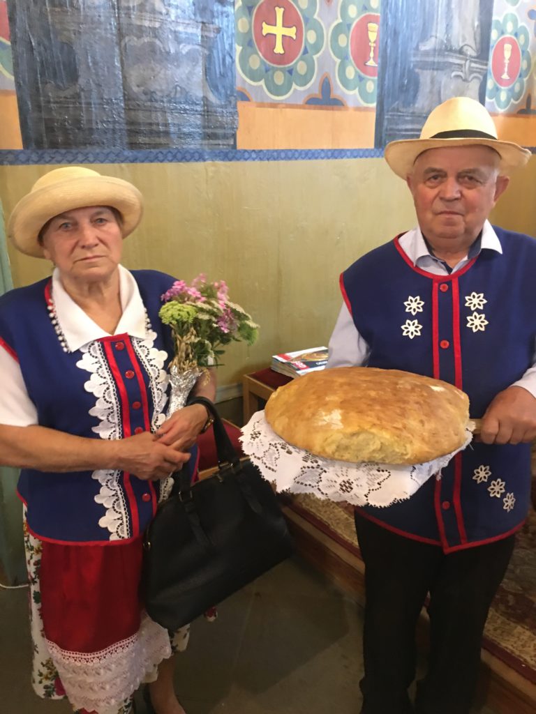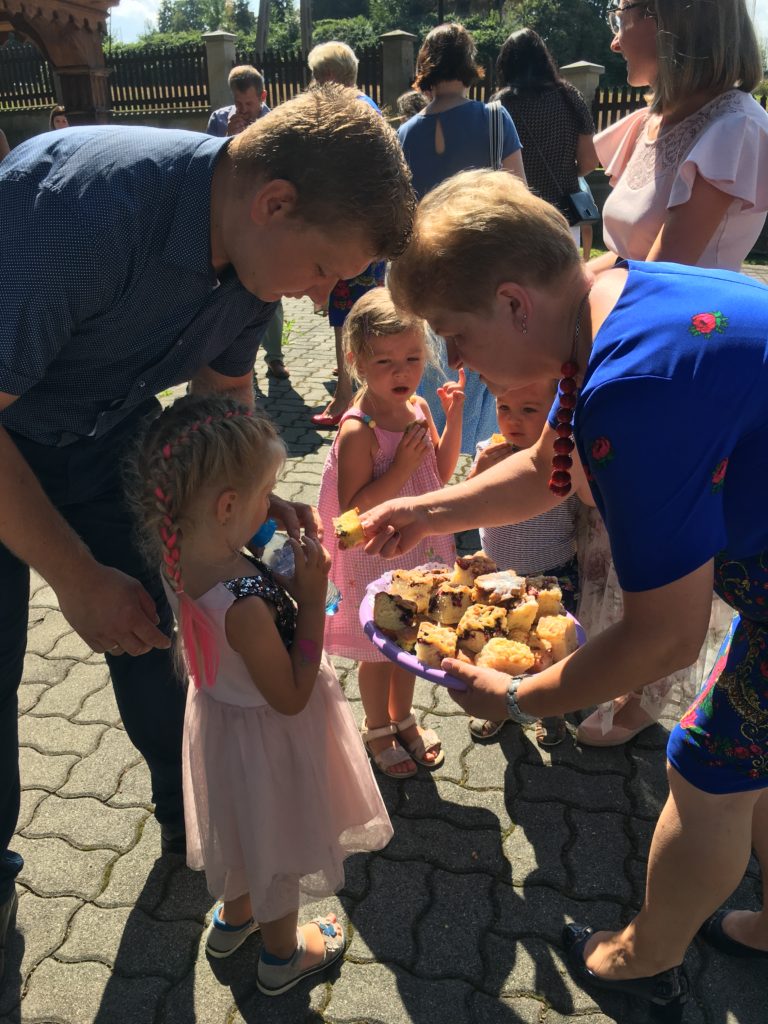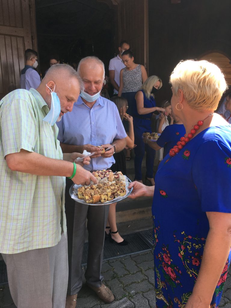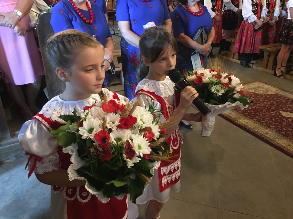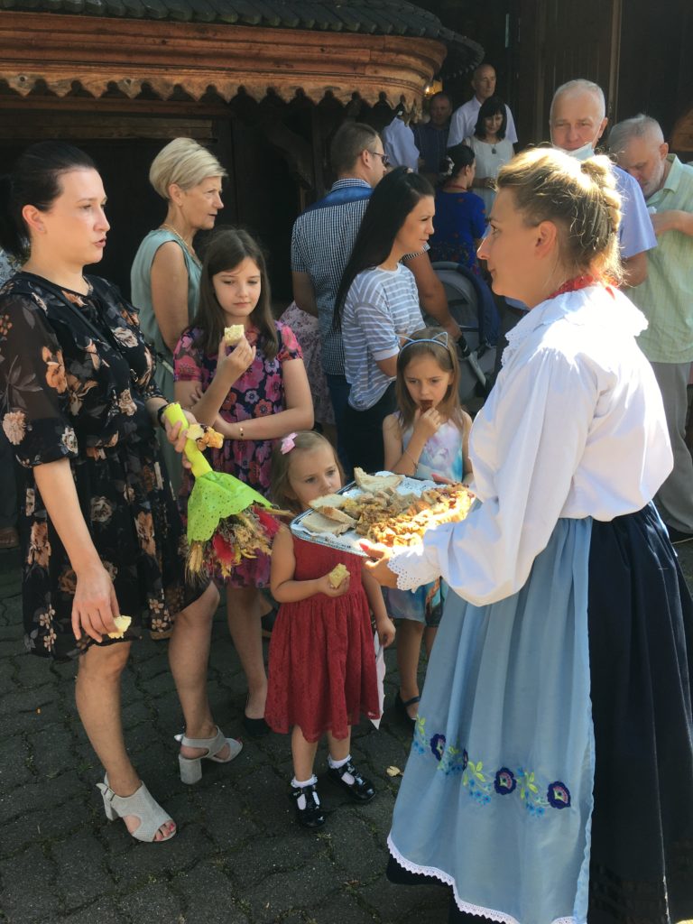 Podczas uroczystej Eucharystii, którą celebrował ks. Stanisław Jachym dziękowaliśmy Panu Bogu za zebrane plony składając dary w postaci chleba, owoców, kwiatów i pięknie wykonanych wieńców żniwnych. Po zakończeniu nabożeństwa na placu kościelnym ks. Proboszcz w obecności Wójta Gminy Łapanów – Andrzeja Śliwy rozpoczął obrzęd dzielenia się chlebem. Panie z kół gospodyń wiejskich oraz gospodarze Grabiny częstowali nie tylko wiejskim chlebem i masłem ale również tradycyjnym drożdżowym ciastem.