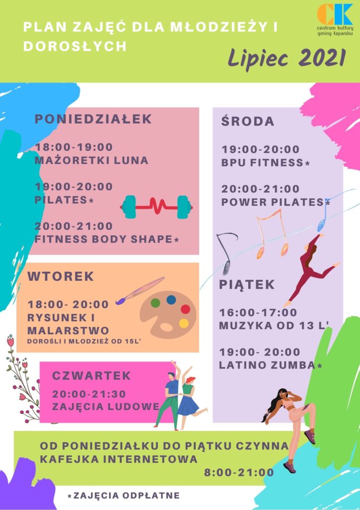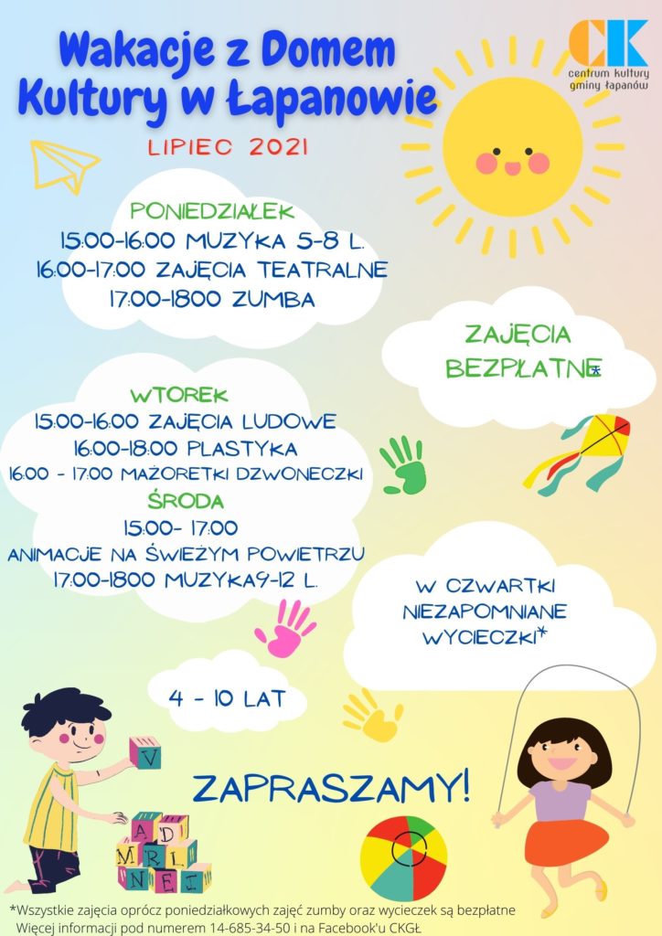 Zapraszamy na „Wakacje z Domem Kultury w Łapanowie” Czeka Was moc wrażeń i atrakcji! Zajęcia, warsztaty, gry, zabawy i wycieczki! Aktywne wakacje dla każdego