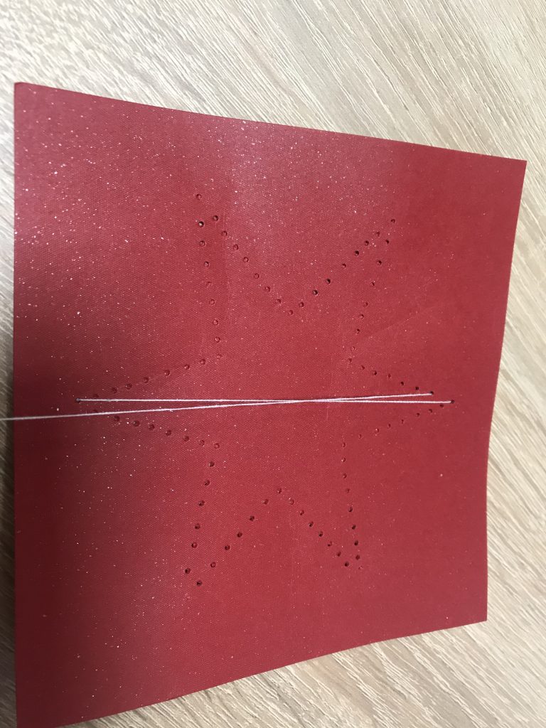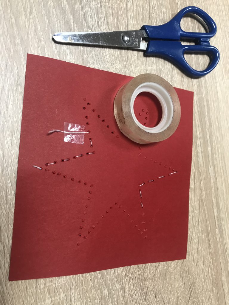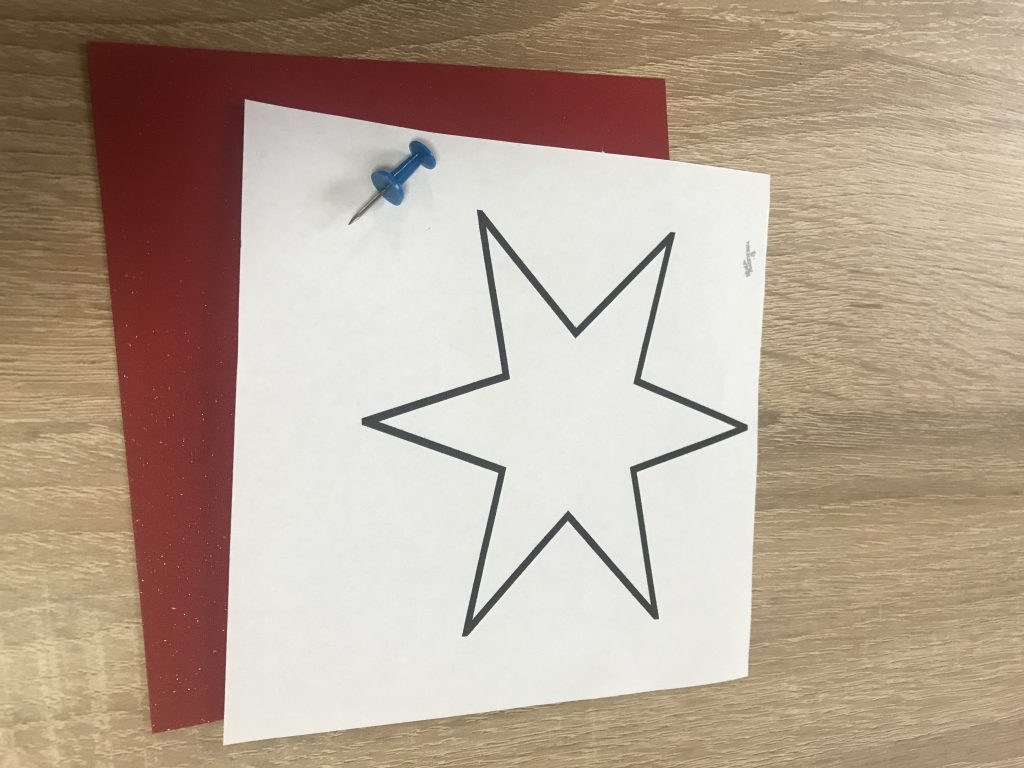 Aby przenieść wzór gwiazdki ( w postaci rysunku) na karton należy przymocować go taśmą klejącą a następnie zgodnie z liniami rysunku nakłuwać niewielkie otworki.