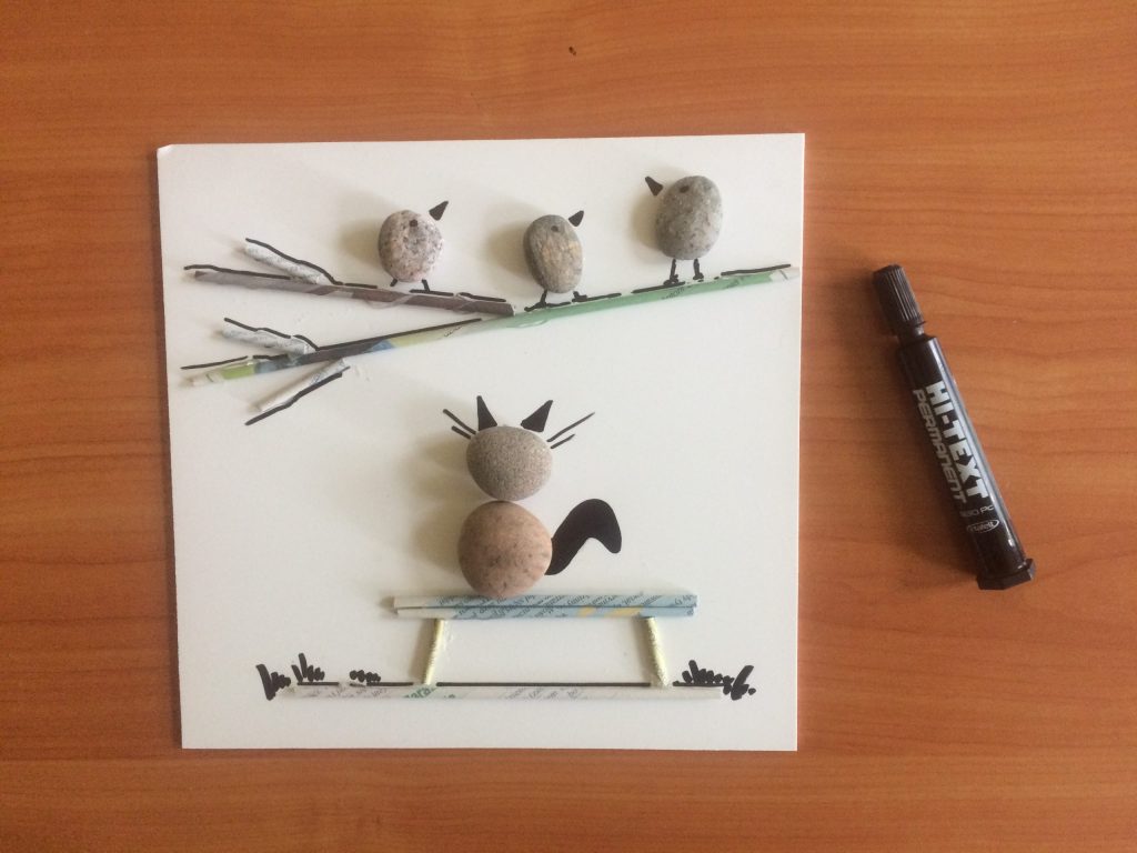 Różne kształty kamyczków pozwolą Ci utworzyć ciekawe formy np. roślin, zwierząt, ptaków, ludzi.