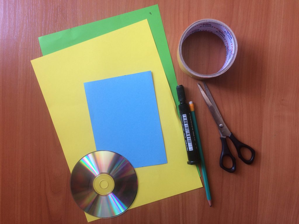 2. Przygotuj główkę, posklejaj i pomaluj. Na płytkę naklej żółty i czarny pasek.