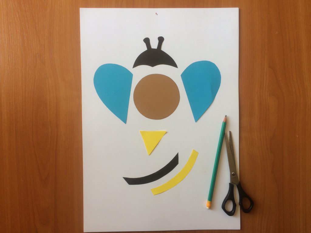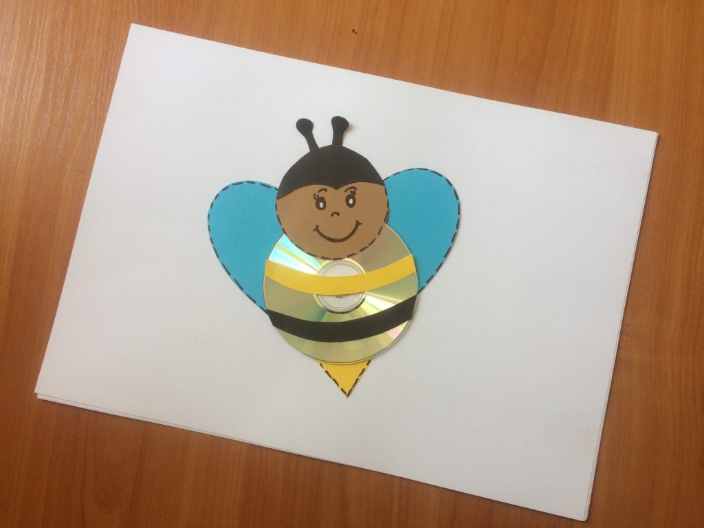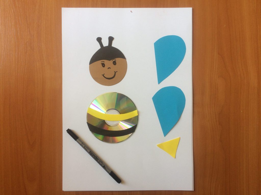 Wesoła pszczółka Do wykonania przygotuj: płytkę, kolorowy papier (obowiązkowo czarny i żółty), nożyczki, taśmę do klejenia, pisaki.