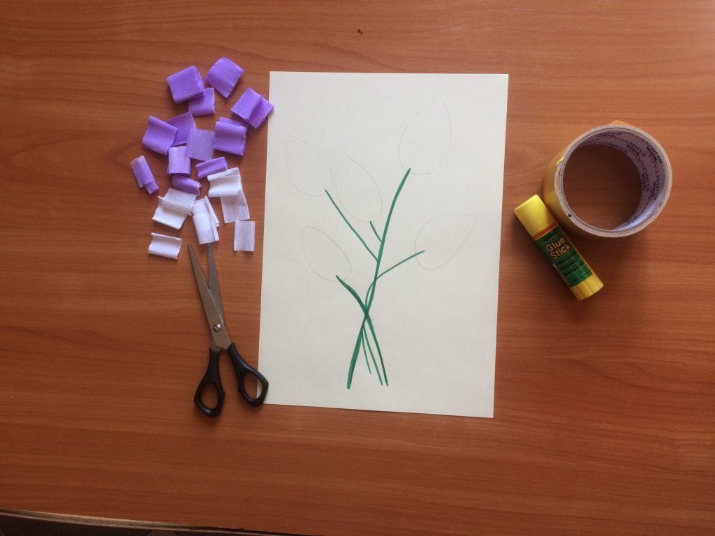 2. Z bibuły wycinamy małe kwadraciki. Miejsca na kwiaty smarujemy kolejno klejem, albo naklejamy taśmę dwustronną.