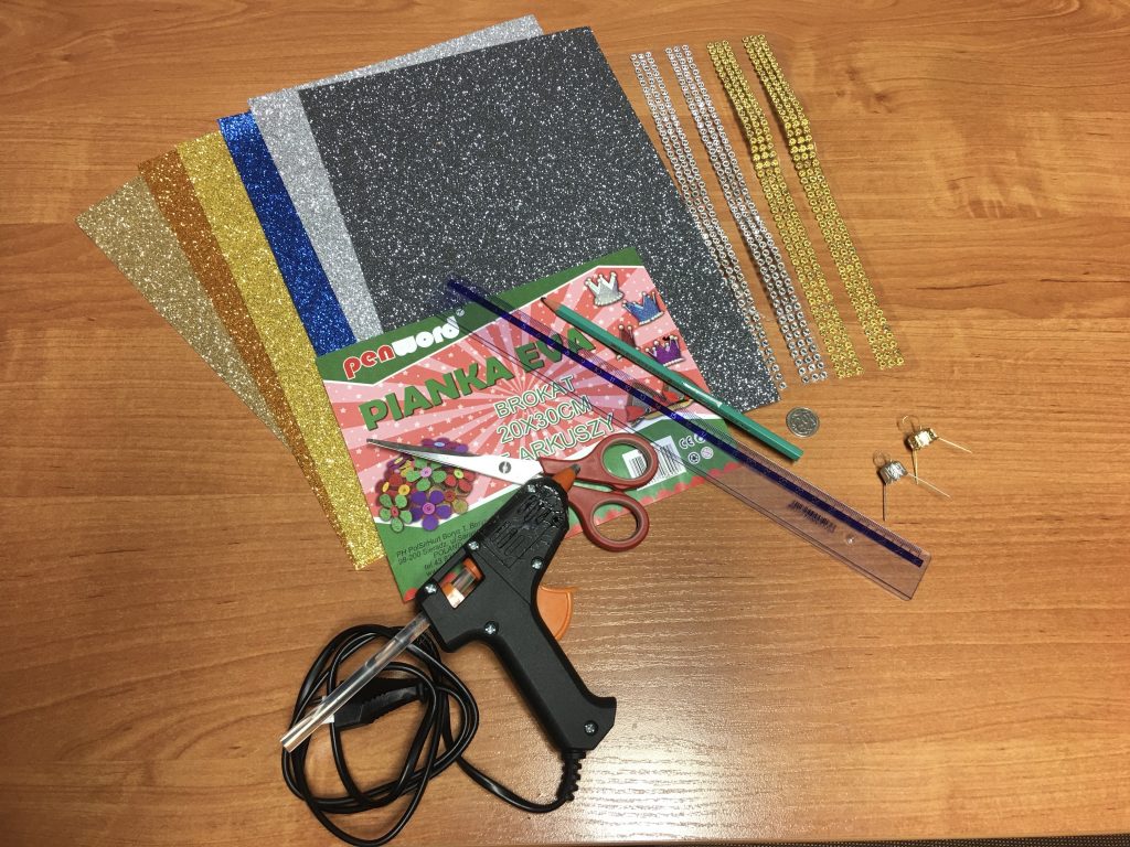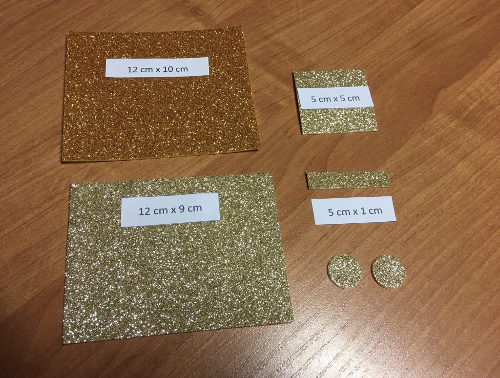 Z dwóch różnych kolorów pianki brokatowej wycinamy dwa prostokąty o wymiarach: 12cm x9 cm oraz 12 cm x 10 cm. Wycinamy także kwadrat o wymiarach 5 cm x 5 cm i paseczek o wymiarze 1 cm x 5 cm. Z kolei od monety20 -groszowej wycinamy dwa kółeczka