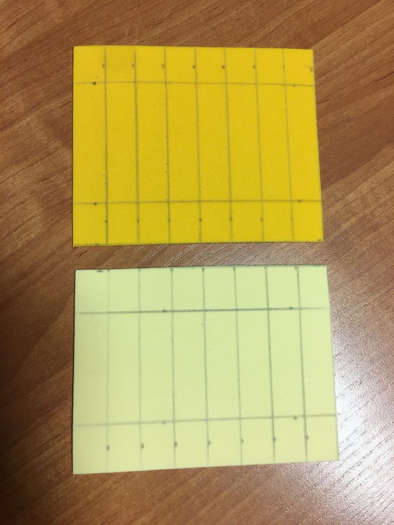 Wycięte dwa prostokąty odwracamy na gładką stronę i na nich rysujemy za pomocą ołówka 8 pasków po 1,5 cm każdy. Po odmierzeniu pasków z prawej i lewej strony odmierzamy po2 cm.