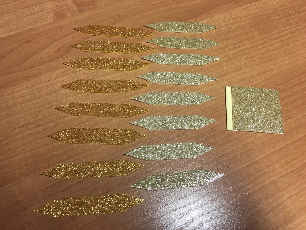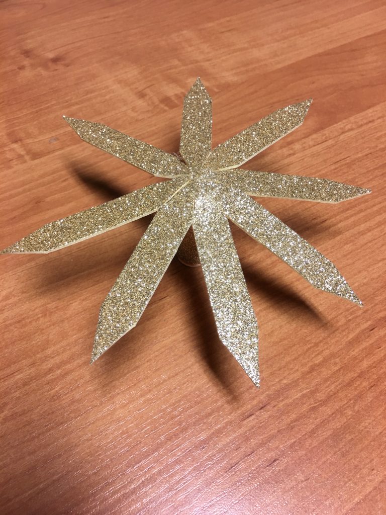 Do podstawy naszej bombki przyklejamy paski o wymiarach 12 cm x 9 cm zaczynając od środka górnego kółeczka. Po przyklejeniu wszystkich pasków powstanie gwiazda.