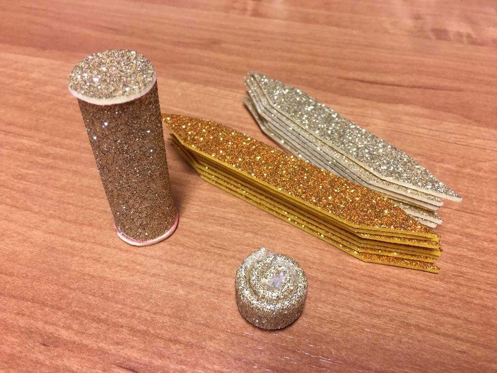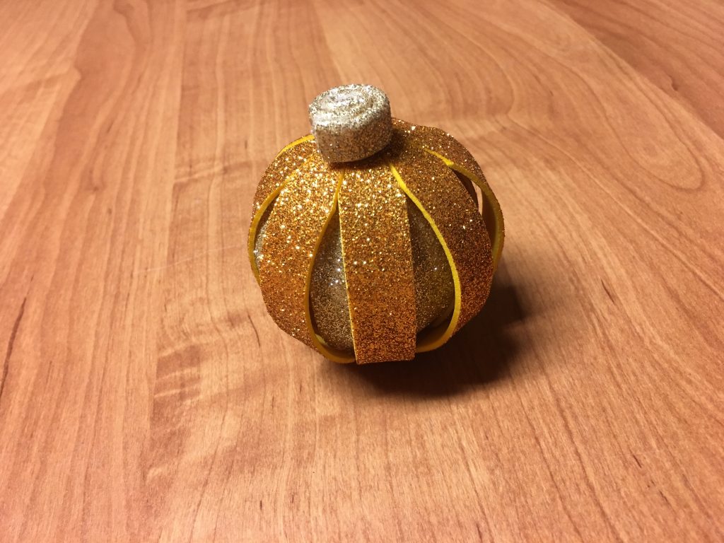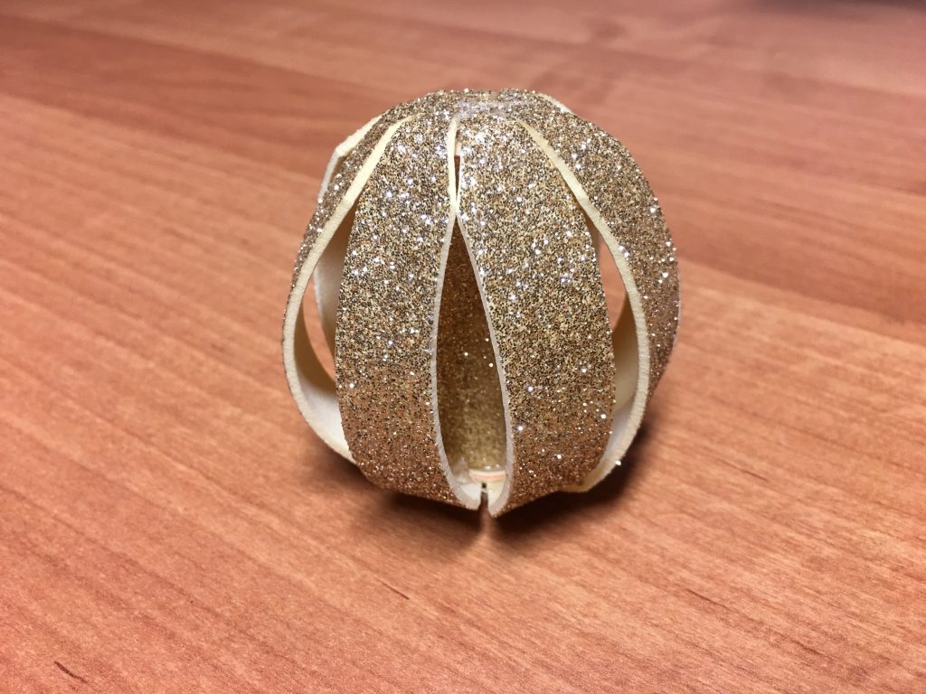 Kwadrat z przyklejonym paskiem składamy w taki sposób aby powstał okrągły szkielet, który będzie podstawą naszej bombki.Do szkieletu od góry i dołu doklejamy także 2 kółeczka wycięte od 20-groszowej monety. Dodatkowo z pianki brokatowej wycinamy pasek2 cm x 8 cm. Po wycięciu składamy go na pół i za pomocą kleju na gorąco sklejamy, a następnie zwijamy w ślimaka.
