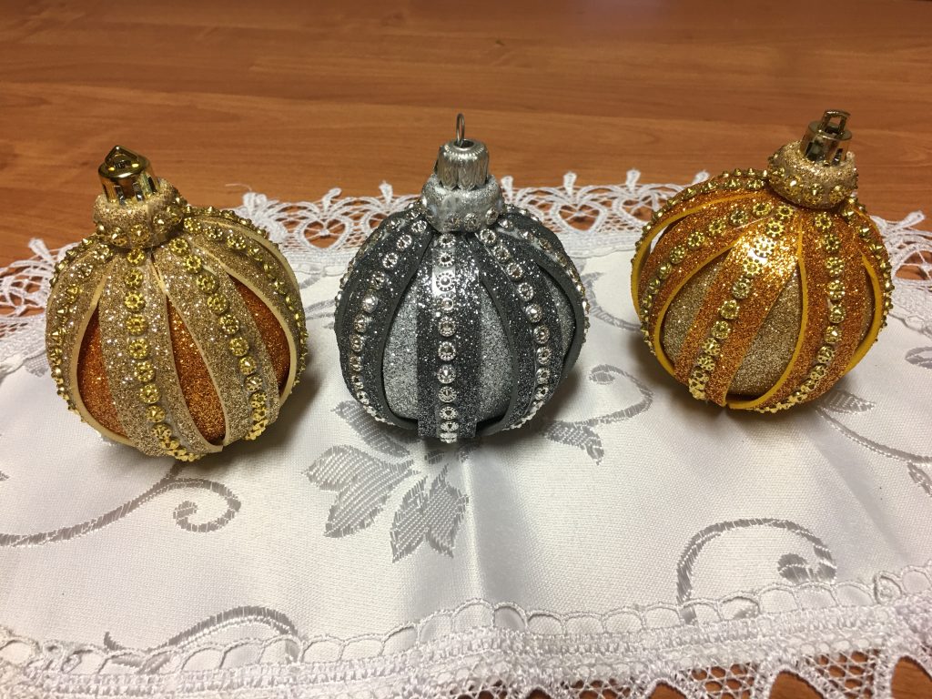 A teraz najprzyjemniejsza część naszego zadania -ozdabianie bombki. Za pomocą kleju przyklejamy ozdobne paski z kryształkami, a na koniec mocujemy gotowy uchwyt.