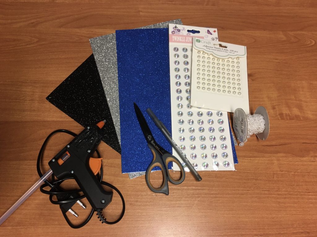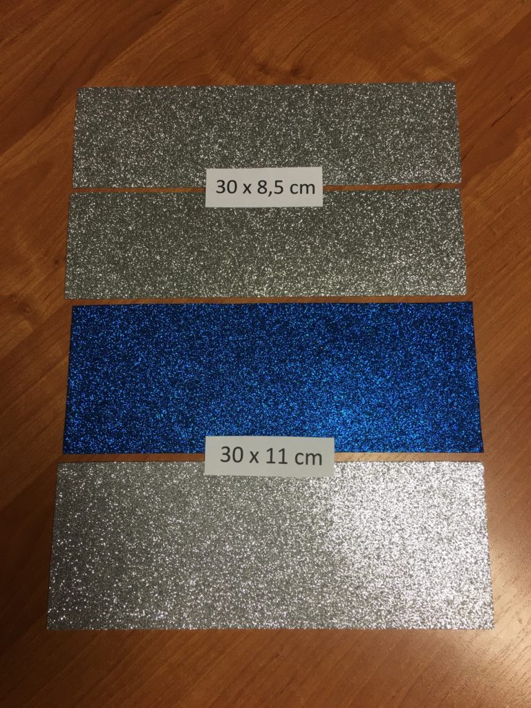 Z pianki brokatowej wycinamy cztery prostokąty. Dwa o wymiarach 30 x 8,5 cm (najlepiej w jednym kolorze) oraz kolejne dwa o wymiarach 30 x 11 cm (w dwóch różnych kolorach).