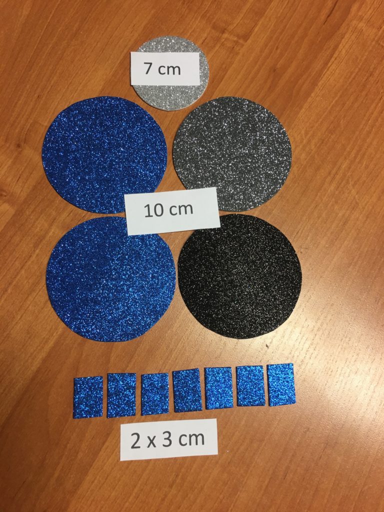Z pianki brokatowej wycinamy także cztery koła o wymiarach 10 cm, jedno o wymiarze 7 cm oraz siedem paseczków o wymiarze 2x 3 cm.