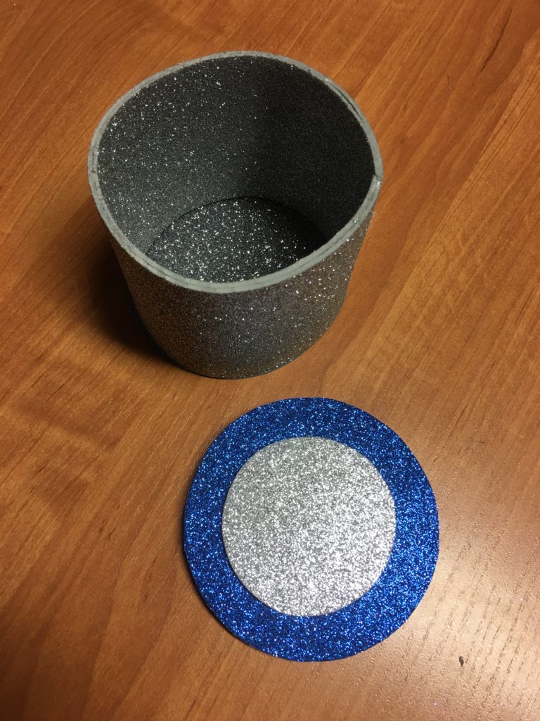 Prostokąty o wymiarach 30 x 8,5cm sklejamy gładką stroną. Następnie zwijamy je w rulon sklejając ich końce. W ten sposób powstanie nam okrągły szkielet naszej szkatułki. Do szkieletu przyklejamy także jedno koło, które będzie spodem szkatułki. Pozostałe trzy koła o wymiarze 10 cm sklejamy ze sobą w ten sposób aby spód i góra były w jednym kolorze. Koła po sklejeniu utworzą nam pokrywe. Z kolei kółko o wymiarze 7 cm przyklejamy na środku naszej pokrywy.