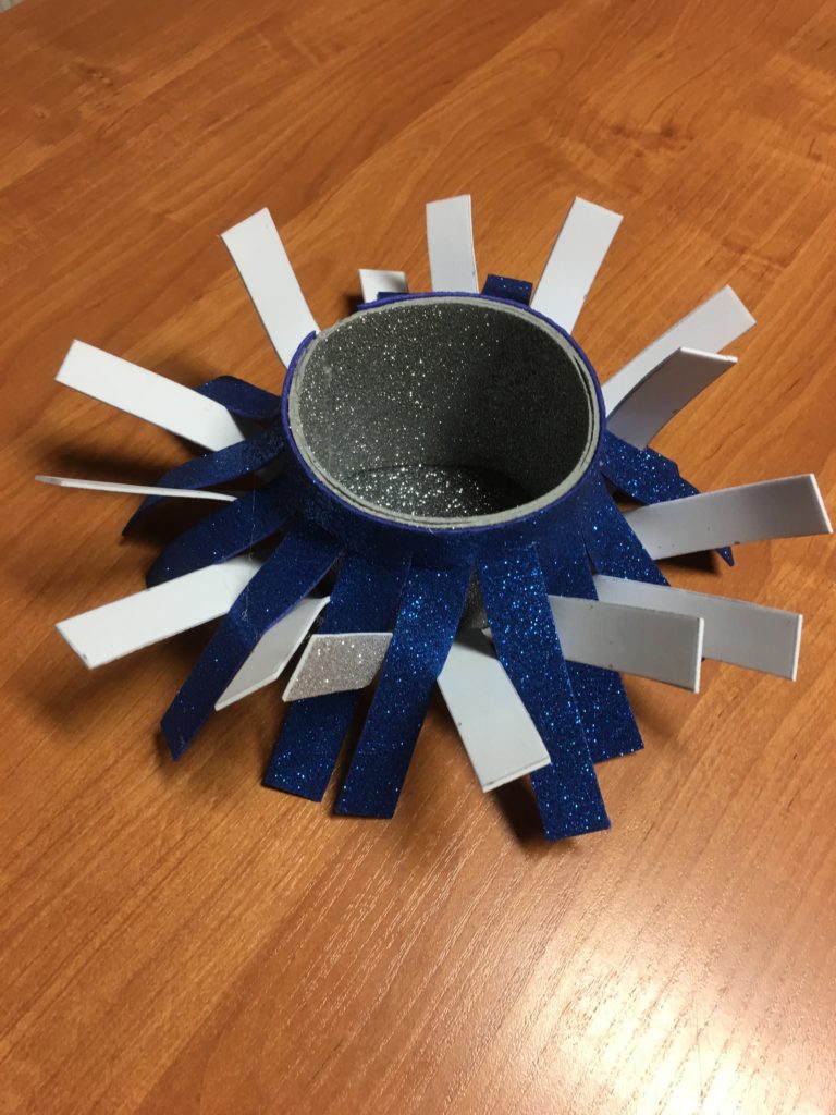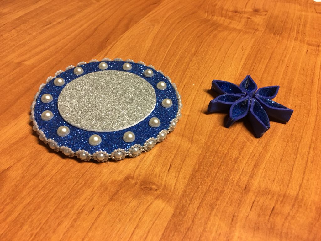 Za pomocą ozdobnej taśmy oklejamy kraj naszej pokrywy a na jej górze przyklejamy białe pół perły. Z kolei z pasków o wymiarach 2 x 3 cm rozpoczynamy formowanie płatków kwiatu. W tym celu rogi każdego z siedmiu pasków sklejamy ze sobą, a następnie każdy płatek przyklejamy jeden koło drugiego formując ozdobny kwiat.