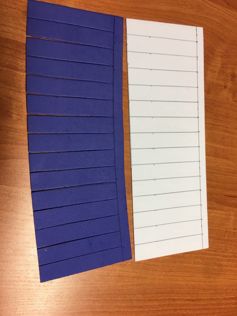Teraz pozostaje nam wykończenie szkieletu szkatułki. W tym celu pozostałe dwa prostokąty o wymiarach 30 x 11 cm odwracamy gładką stroną i odmierzamy za pomocą linijki 1 cm od góry przez całą jego długość. Z kolei od 1 cm w dół rysujemy paski o szerokości 2 cm. Paski te należy rozciąć nożyczkami do górnej linii 1 cm.