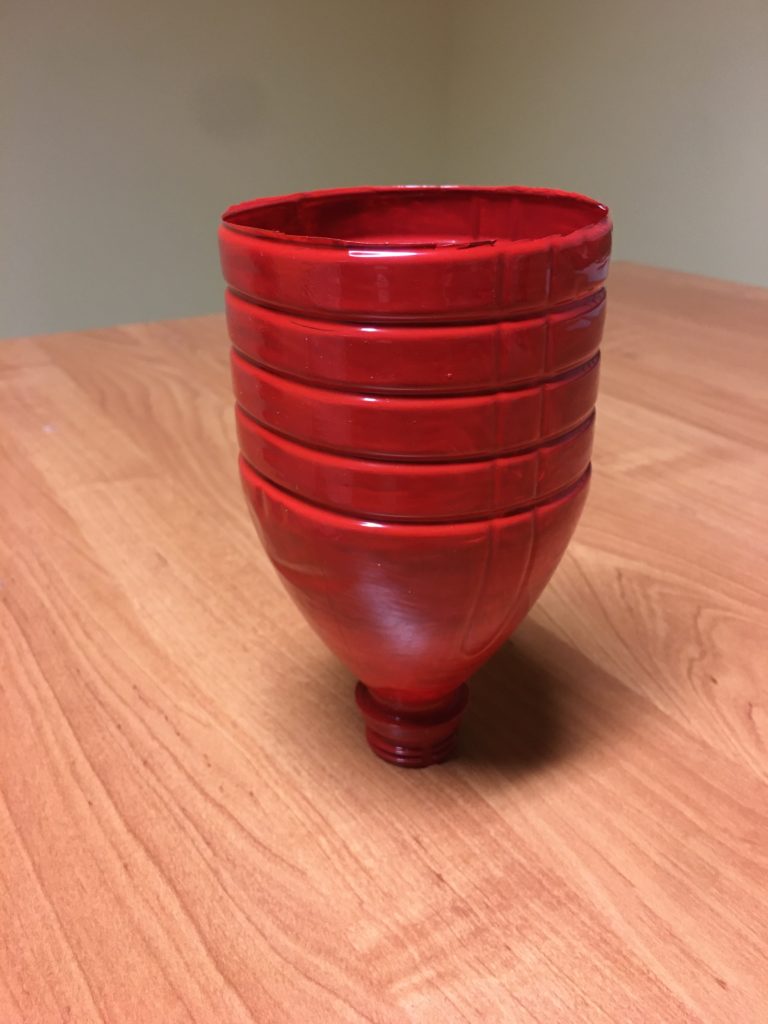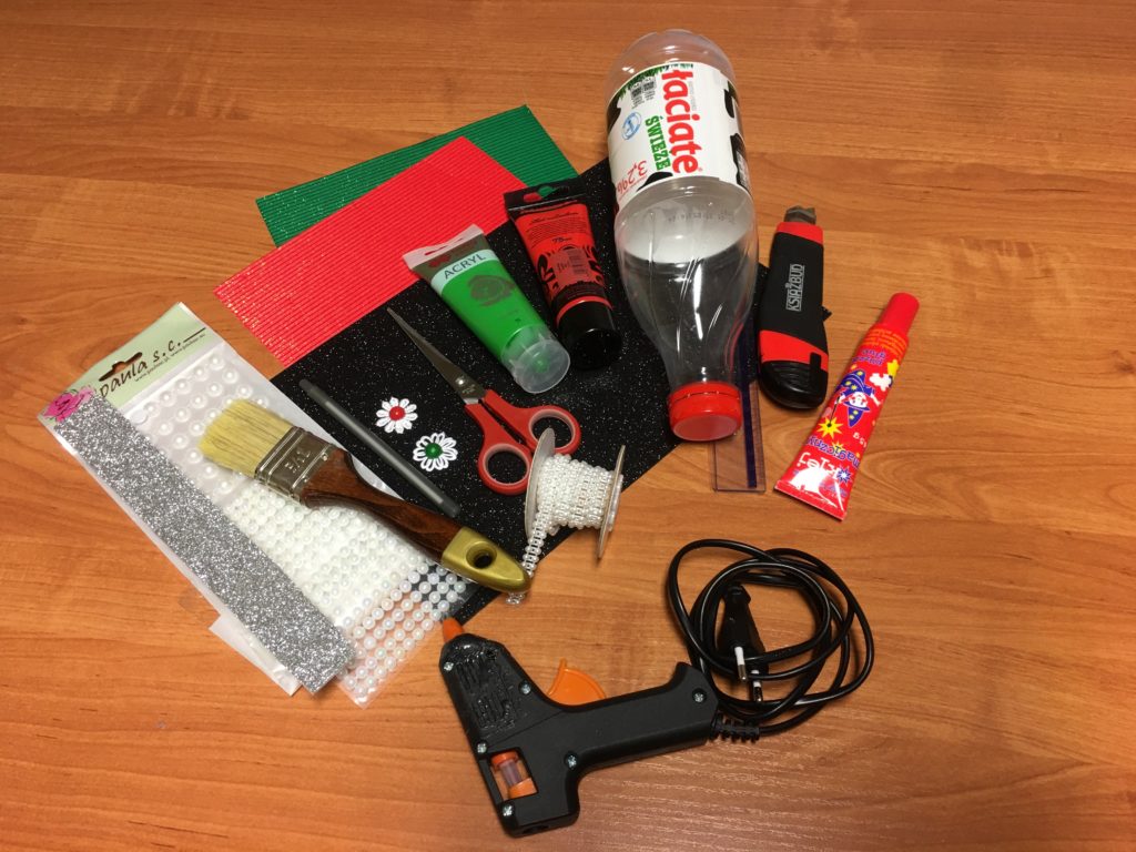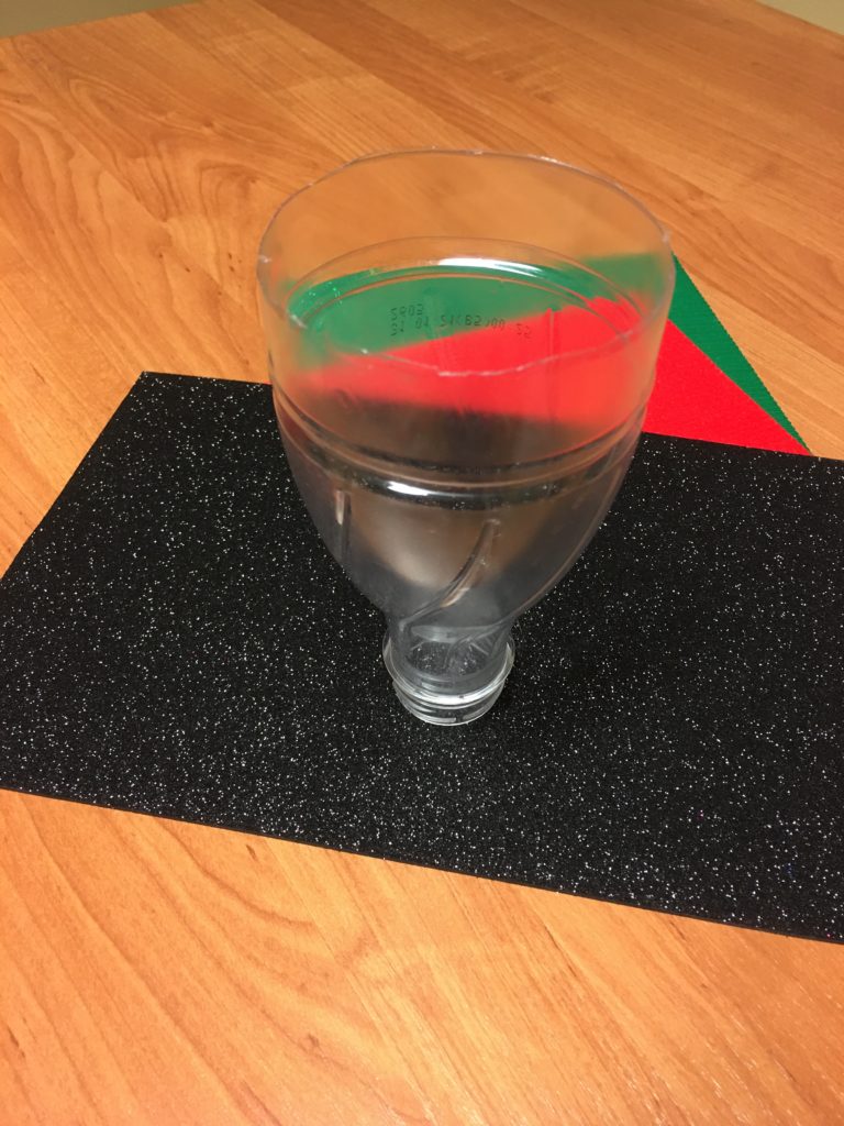 Z butelki plastikowej należy oderwać etykietę, a samą butelkę oczyścić z resztek kleju. Następnie za pomocą nożyka do tapet odcinamy butelkę na około 16 cm wysokości (mierząc od korka w górę). Odkręcamy także korek i usuwamy plastikową otoczkę.