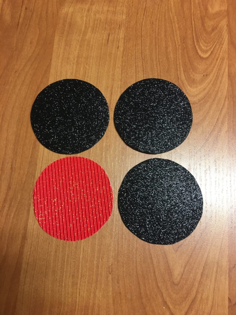 Z pianki brokatowej samoprzylepnej wycinamy 3 koła o szerokości 9 cm, z kolei z tektury falistej wycinamy 1 koło o tej samej szerokości