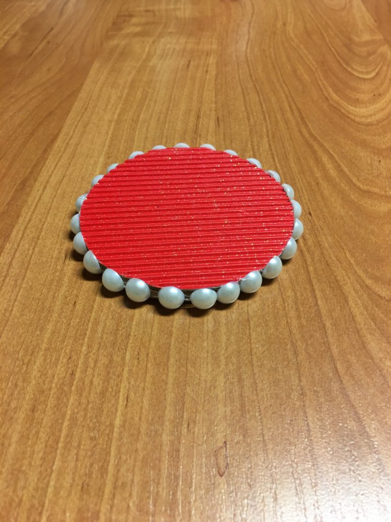 Po ich wycięciu sklejamy je ze sobą pamiętając aby kółko z tektury falistej było na samej górze. Następnie za pomocą perełek lub ozdobnej taśmy oklejamy ich kraj.