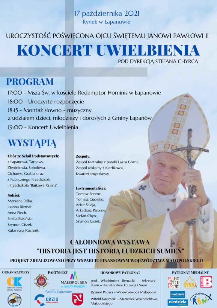 Dlatego zapraszamy Państwa na Koncert pod dyrekcją Stefana Chyrca poświęcony Janowi Pawłowi II, który odbędzie się na łapanowskim rynku 17 października o godzinie 18:00.
